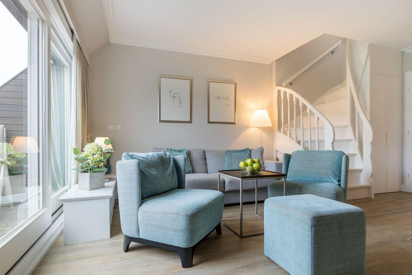 Der lichtdurchflutete Wohnbereich ist mit einem gemütlichen Sofa, zwei Sesseln und einem Esstisch für vier Personen ausgestattet. Die technische Ausstattung umfasst einen TV, Blu-ray-Recorder sowie ein Bose Music System mit Bluetooth für erstklassigen Klanggenuss. Der direkte Zugang zum möblierten Balkon mit Ausrichtung nach Südwesten macht den Raum zum idealen Rückzugsort, um die Sonne und die frische Nordseeluft zu genießen.