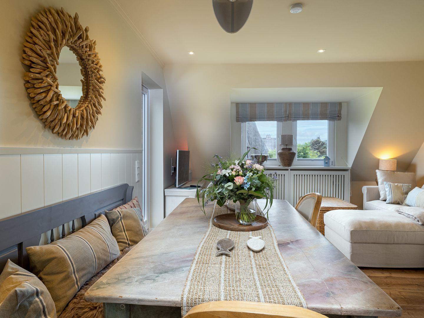 Wohn-/Essbereich: Der sehr helle Wohnbereich mit Smart-TV bietet einen gemütlichen Rückzugsort mit Schlafsofa (140 x 200 cm) und verfügt über ein tolles Beleuchtungskonzept. Der großzügige Esstisch lädt zum Verweilen ein und bietet genügend Platz für ausgedehnte Mahlzeiten. Von diesem Raum aus gelangen Sie ebenfalls auf den schönen und ruhigen Ostbalkon, ausgestattet mit Gartenmöbeln und Elektrogrill und Blick ins Grüne. Die offene und top ausgestattete Küche mit u.a. Waschmaschine und Backofen mit Mikrowellen-Funktion grenzt direkt an den Essbereich.
