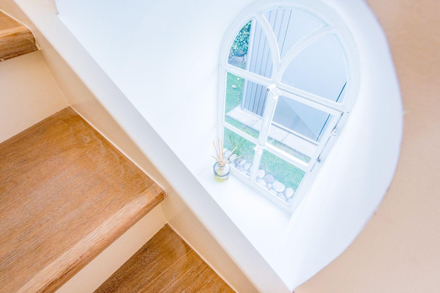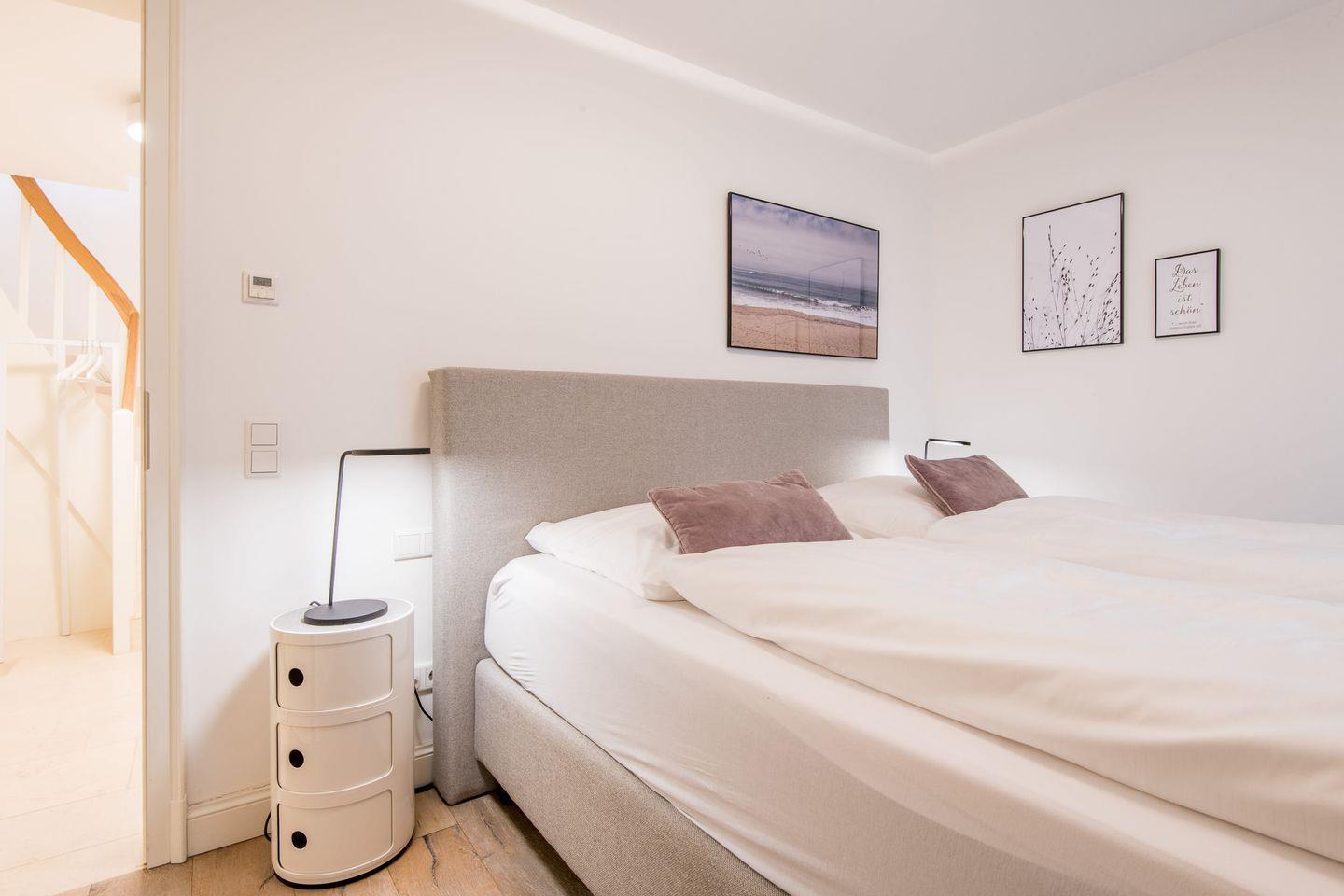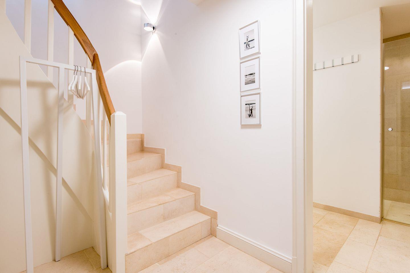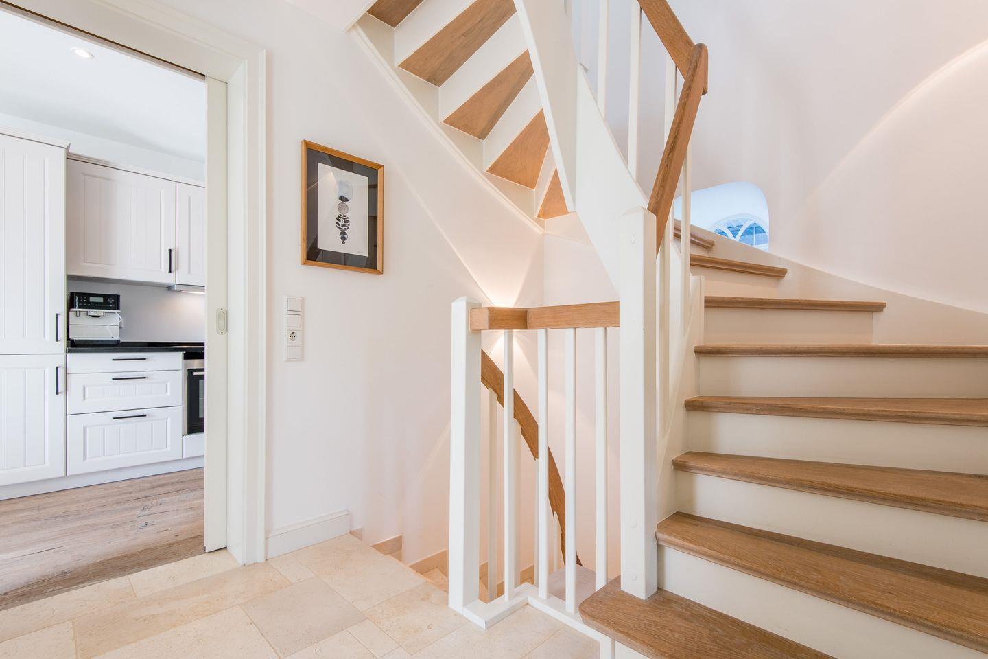 Vom großzügigen Flur führt eine Treppe in das helle und exklusiv eingerichtete Obergeschoss mit hohen Decken: