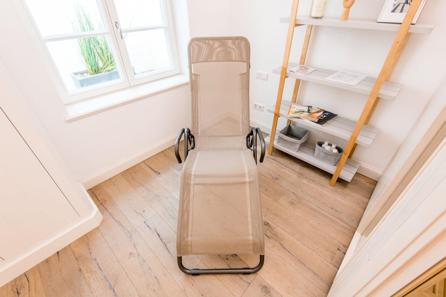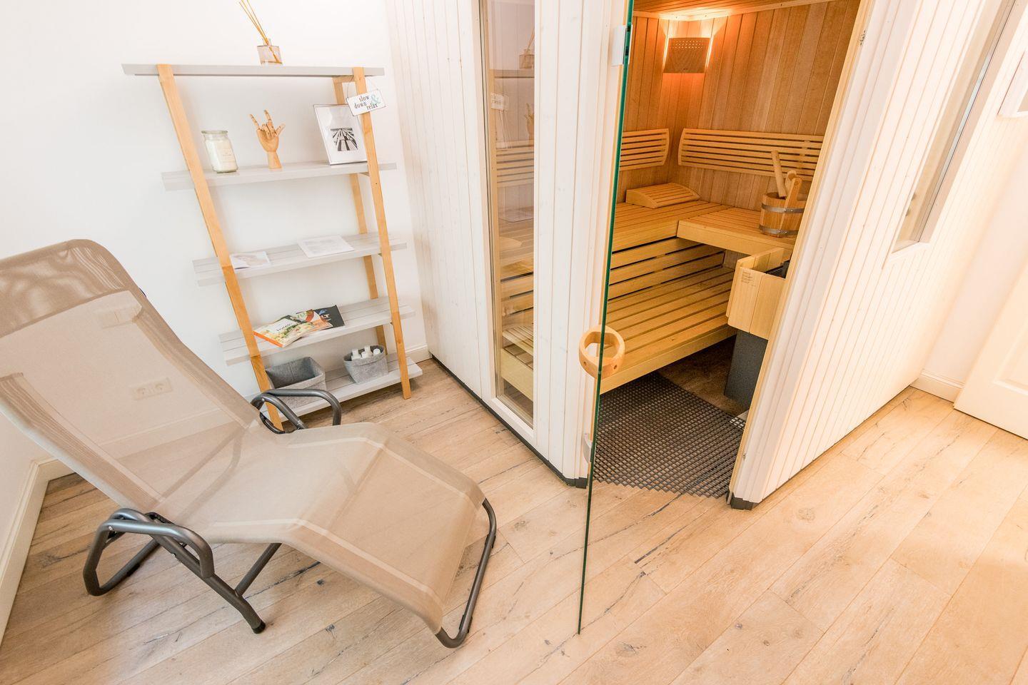 Wellness: großzügige Sauna mit schönem Ruhebereich.