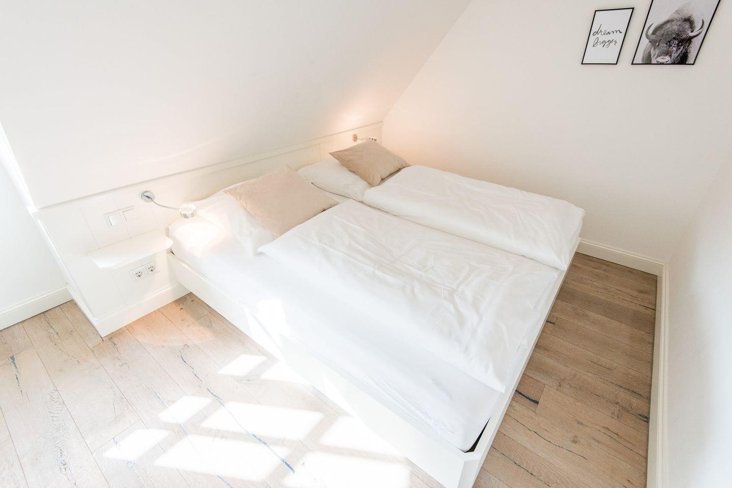 Schlafzimmer 1: Boxspringbett (1,80 x 2,0 m), Einbauschränke, TV und Fenster nach Süden.
