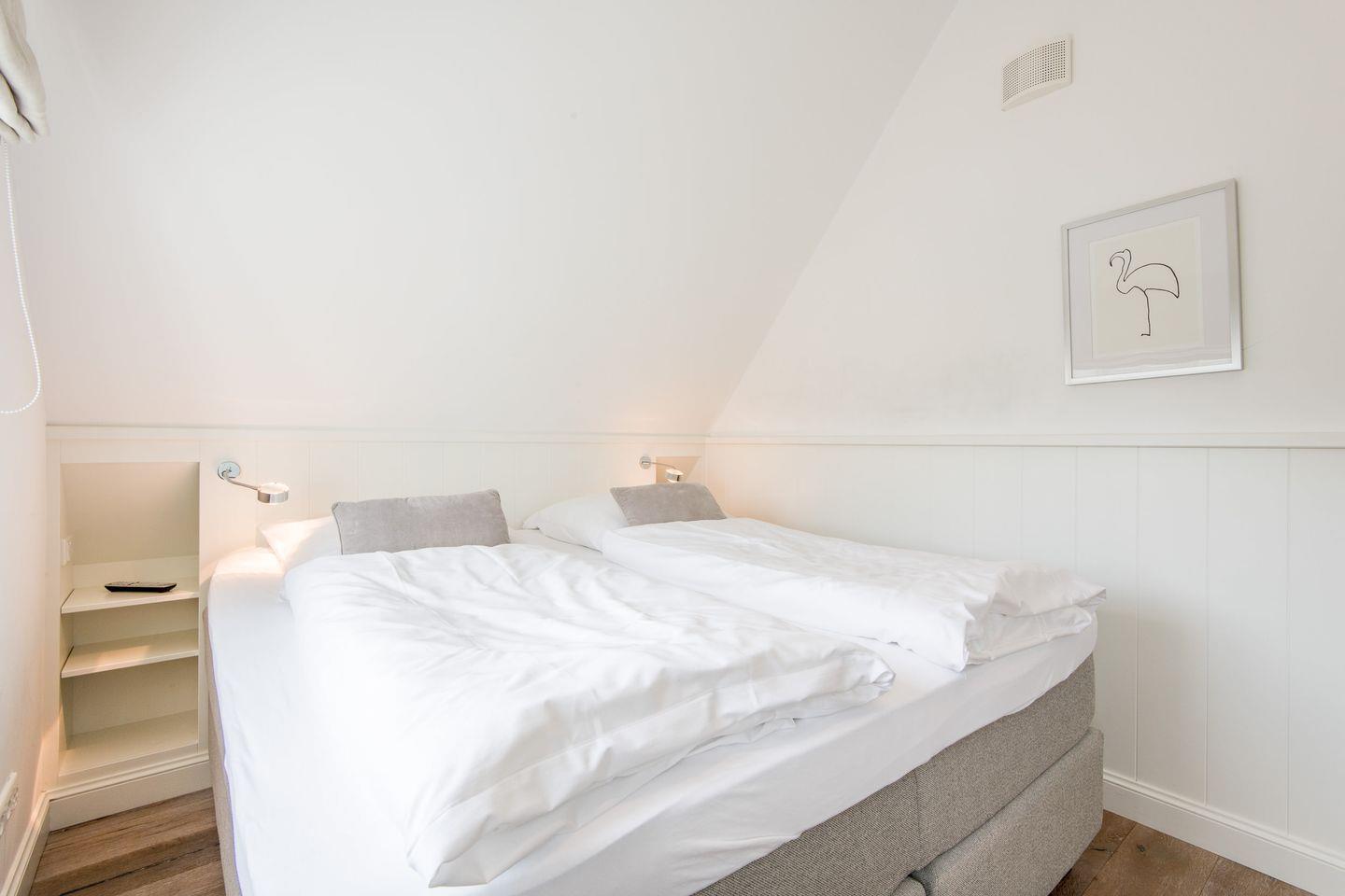 Schlafzimmer 2: Doppelbett (1,80 x 2,0 m), Einbauschränke, TV und kleinem Schreibtisch sowie Fenster nach Westen.
