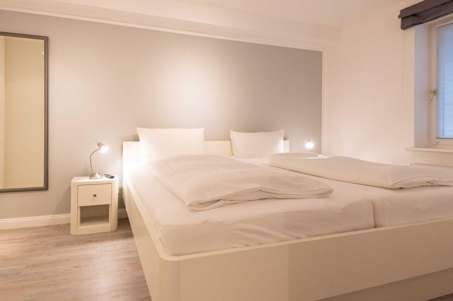 Schlafzimmer 1: Doppelbett, Kleiderschrank, TV und Fenster.