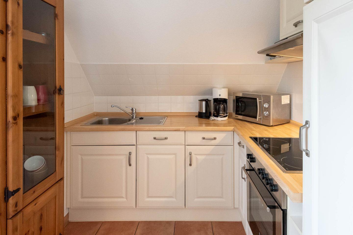Wohn-/Koch-/Essbereich: Lichtdurchfluteter und geräumiger Wohnraum mit einer Sofaecke, Sessel & TV. Bei dem Sofa handelt es sich um ein Schlafsofa, welches in ausgezogenem Zustand eine Liegefläche von 1,40 m x 2,00 m hat und einen Schlafplatz für eine dritte Person bietet. Der Essbereich mit Eckbank lädt zu geselligen Mahlzeiten ein. Die halboffene und im Landhausstil eingerichtete Küche ist gut ausgestattet. Einbauschränke in dieser Etage bieten ausreichend Stauraum.