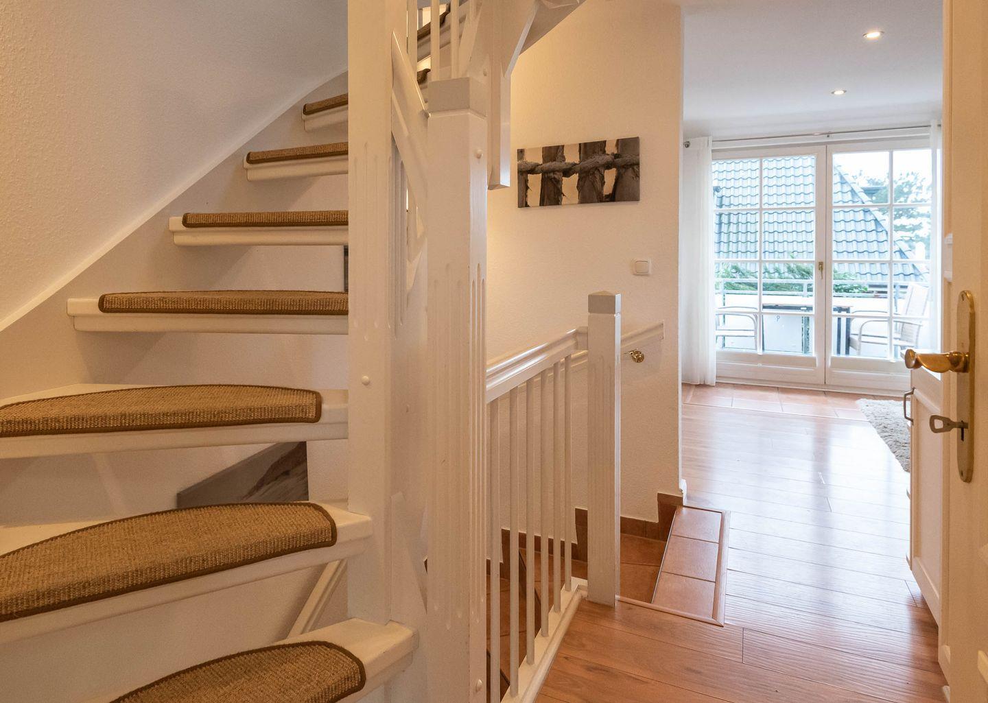 Im Erdgeschoss gelangen Sie durch die Haus- und Wohnungstür in einen kleinen Flur mit Schuhschrank und Garderobe. Über eine gut begehbare Treppe mit Treppengeländer gelangen Sie in das erste Obergeschoss.