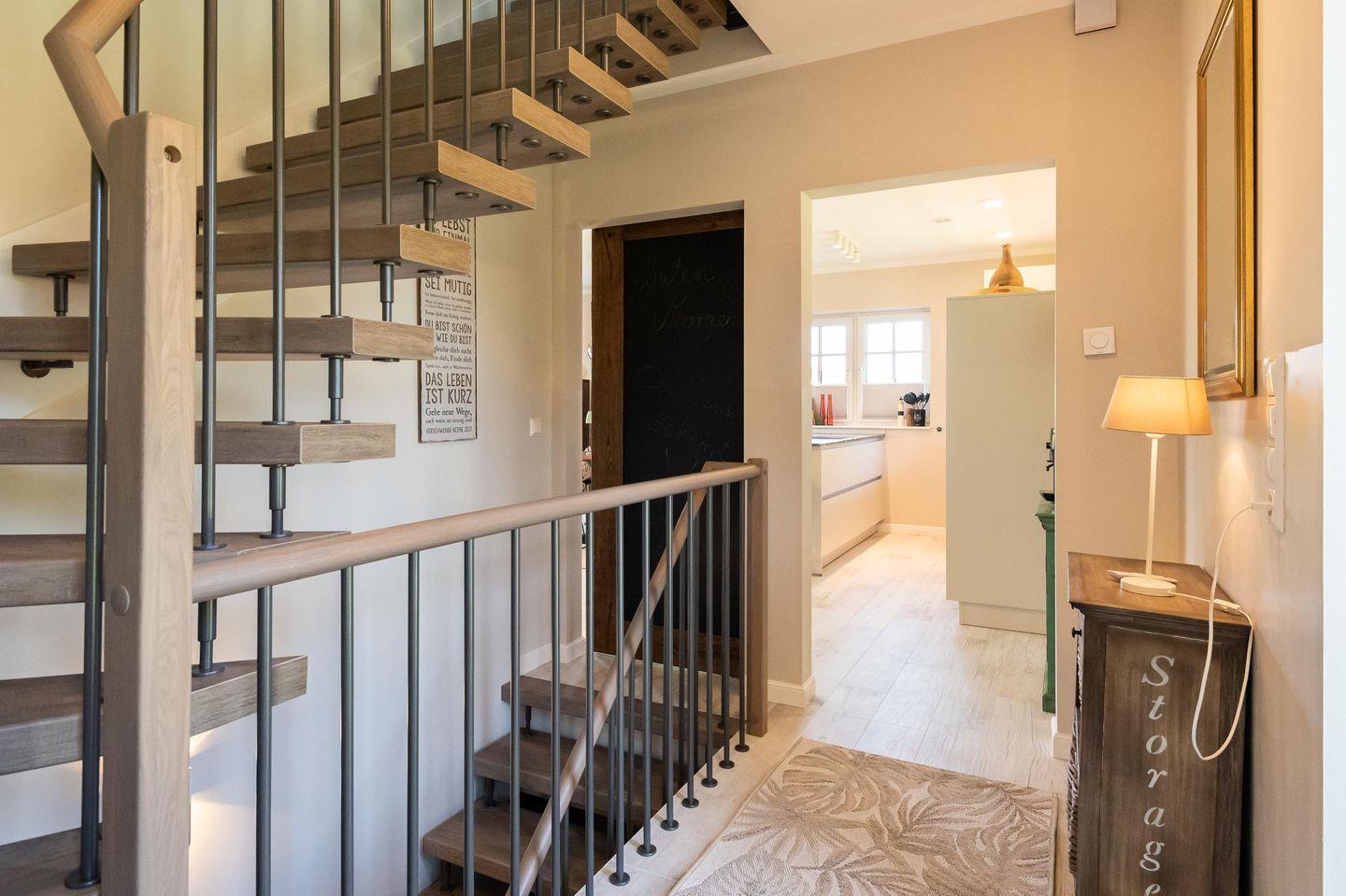 Über eine freitragende Treppe gelangen Sie in das exklusiv eingerichtete Obergeschoss: