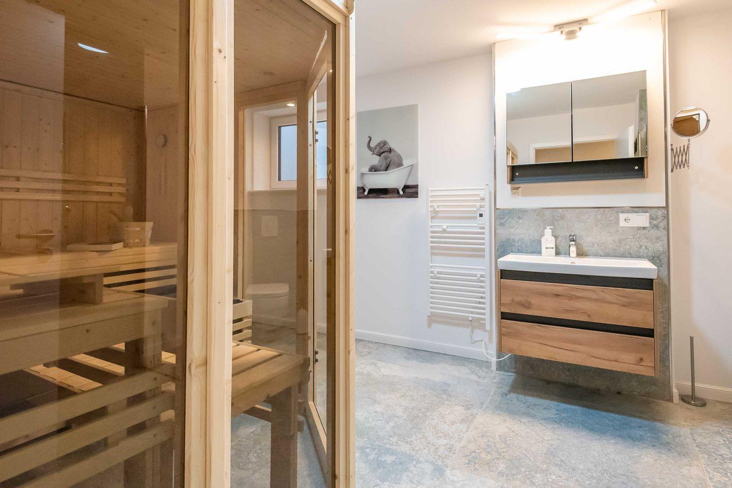 Badezimmer 2 & Sauna: Großzügiges maritimes Badezimmer mit bodengleicher Regendusche, Handtuchtrockner, Fenster und großer Sauna zur Eigennutzung.
