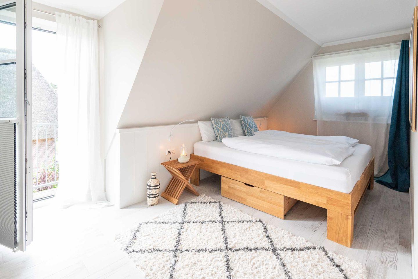 Schlafzimmer 1: Doppelbett (180 x 200 cm) und großer Kleiderschrank. Über eine bodentiefe Tür können Sie einen französischen Balkon betreten und den Ausblick nach Südwesten genießen.