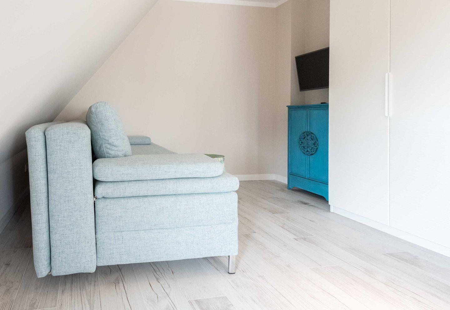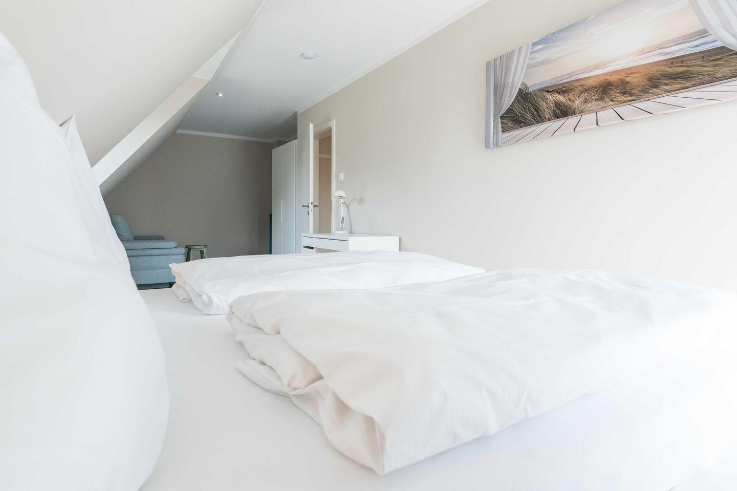 Schlafzimmer 1: Doppelbett (180 x 200 cm), großer Kleiderschrank, Sofa und TV. In diesem Schlafzimmer befindet sich ein kleiner Schreibtisch, der auch mobiles Arbeiten im Urlaub ermöglicht. Über eine bodentiefe Tür können Sie einen französischen Balkon betreten und den Ausblick nach Südwesten genießen.