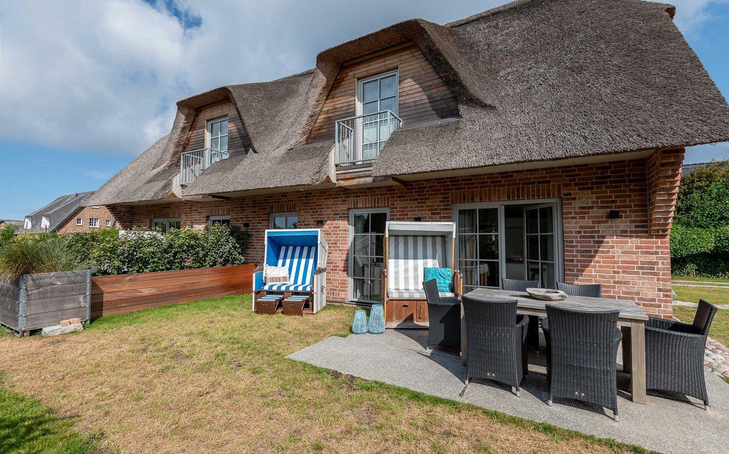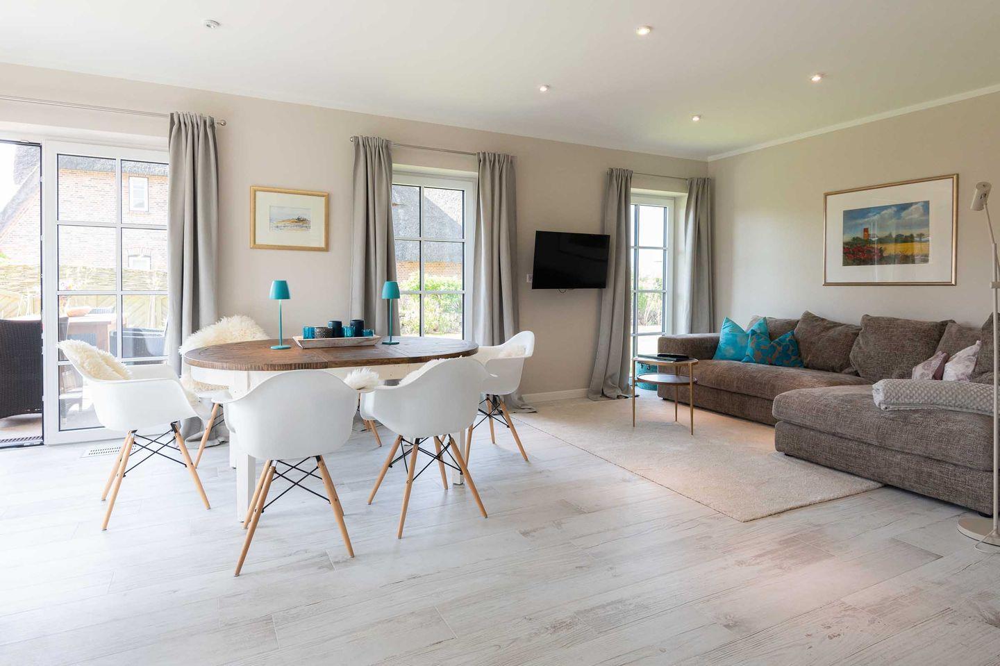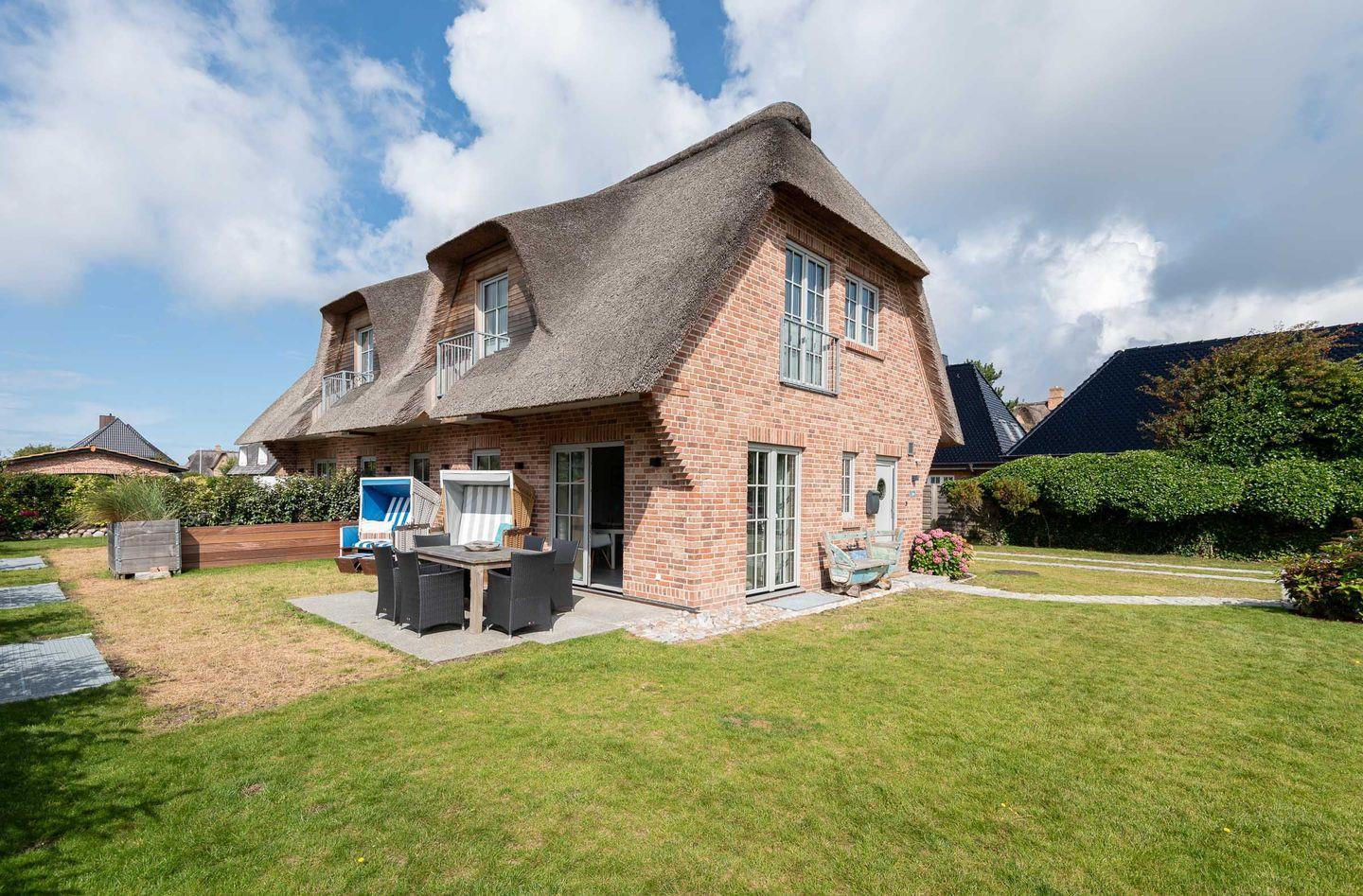 Moderne und nachhaltige Haushälfte unter Reet mit ca. 110 m² bietet mit Garten, Süd-Terrasse, eigener Außen-Sauna und ruhiger Lage in Wenningstedt helle und großzügige Wohnfläche für 6 Personen.