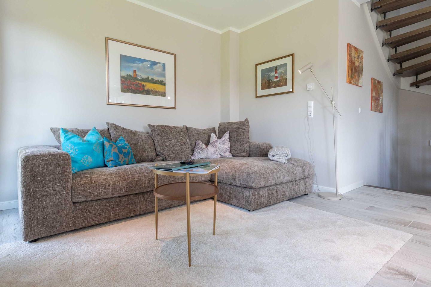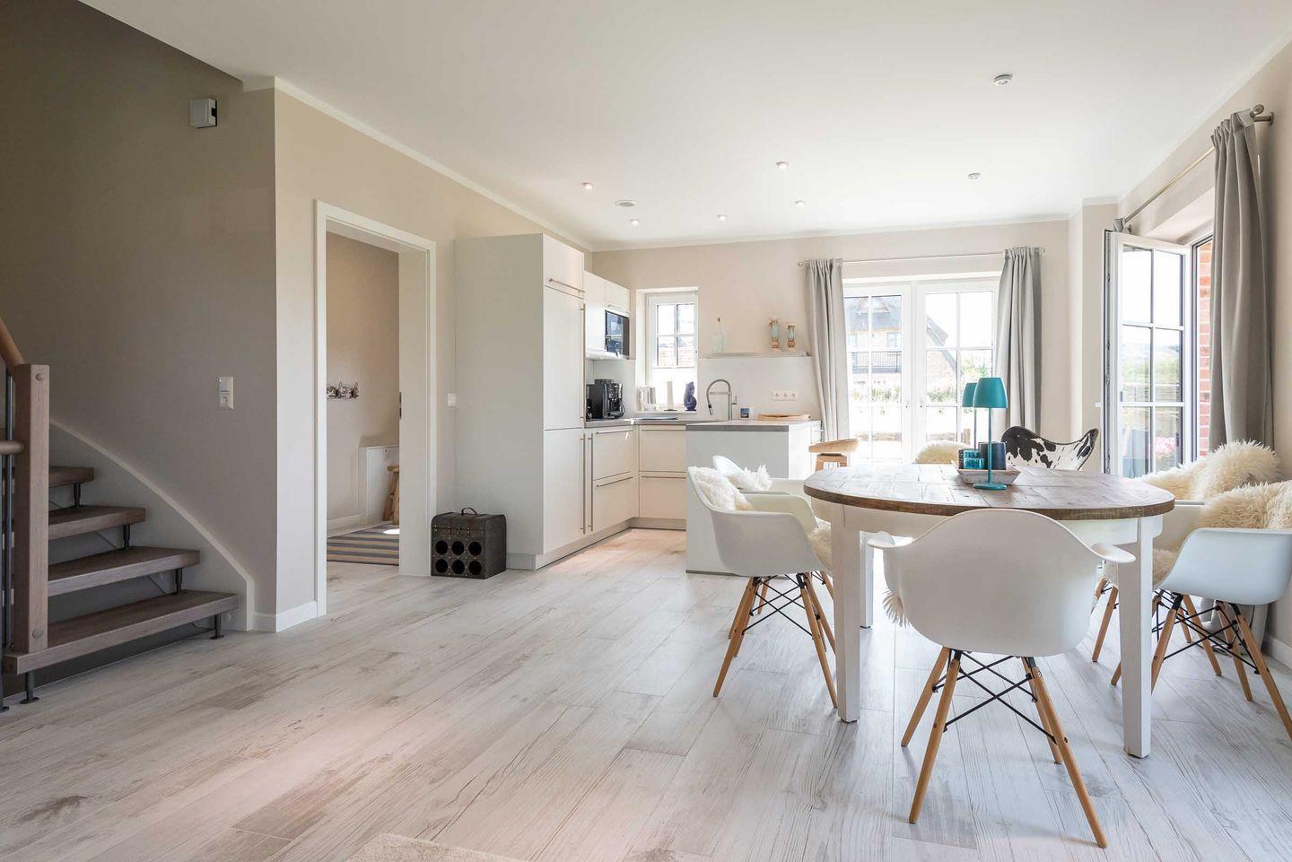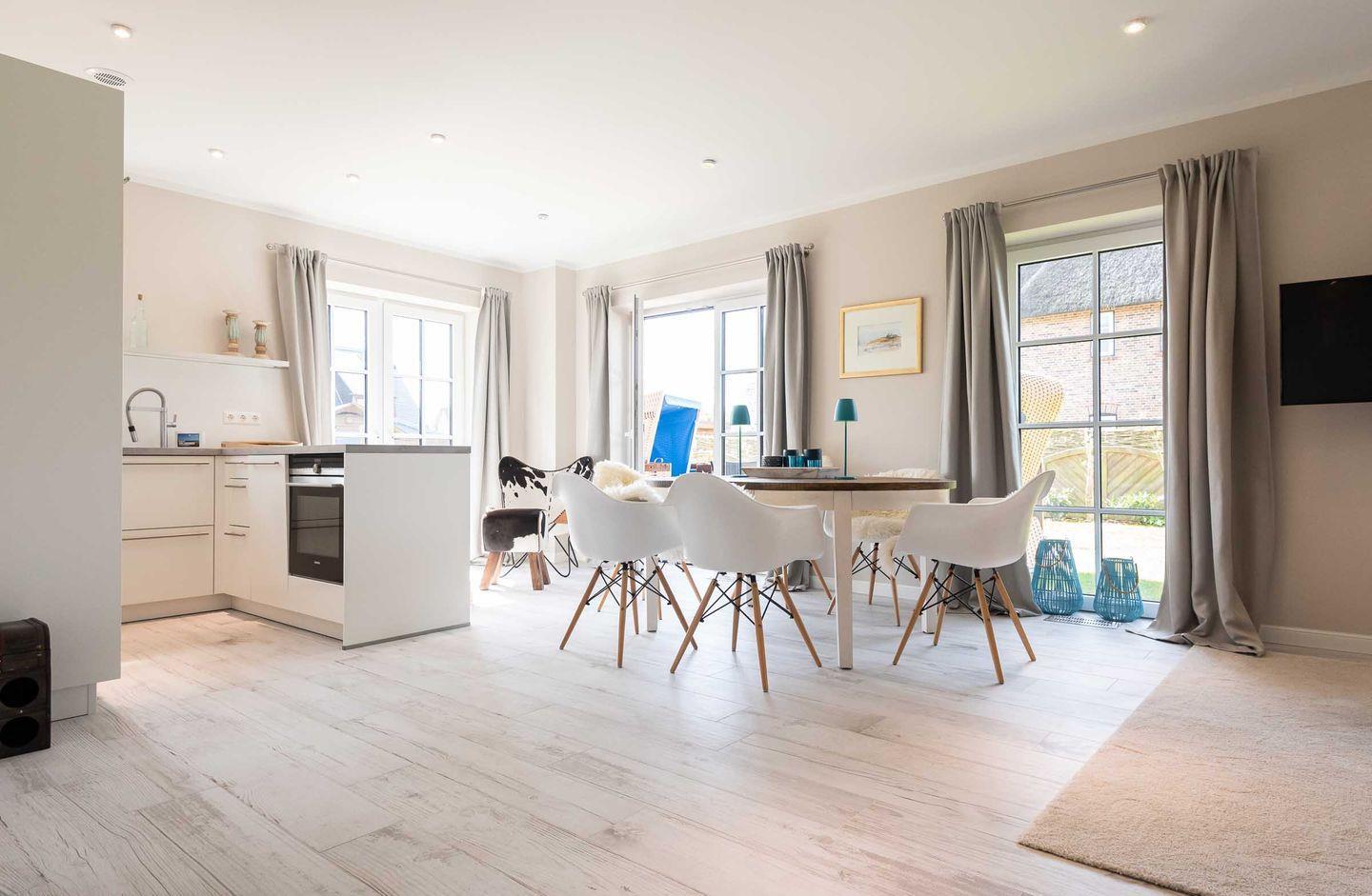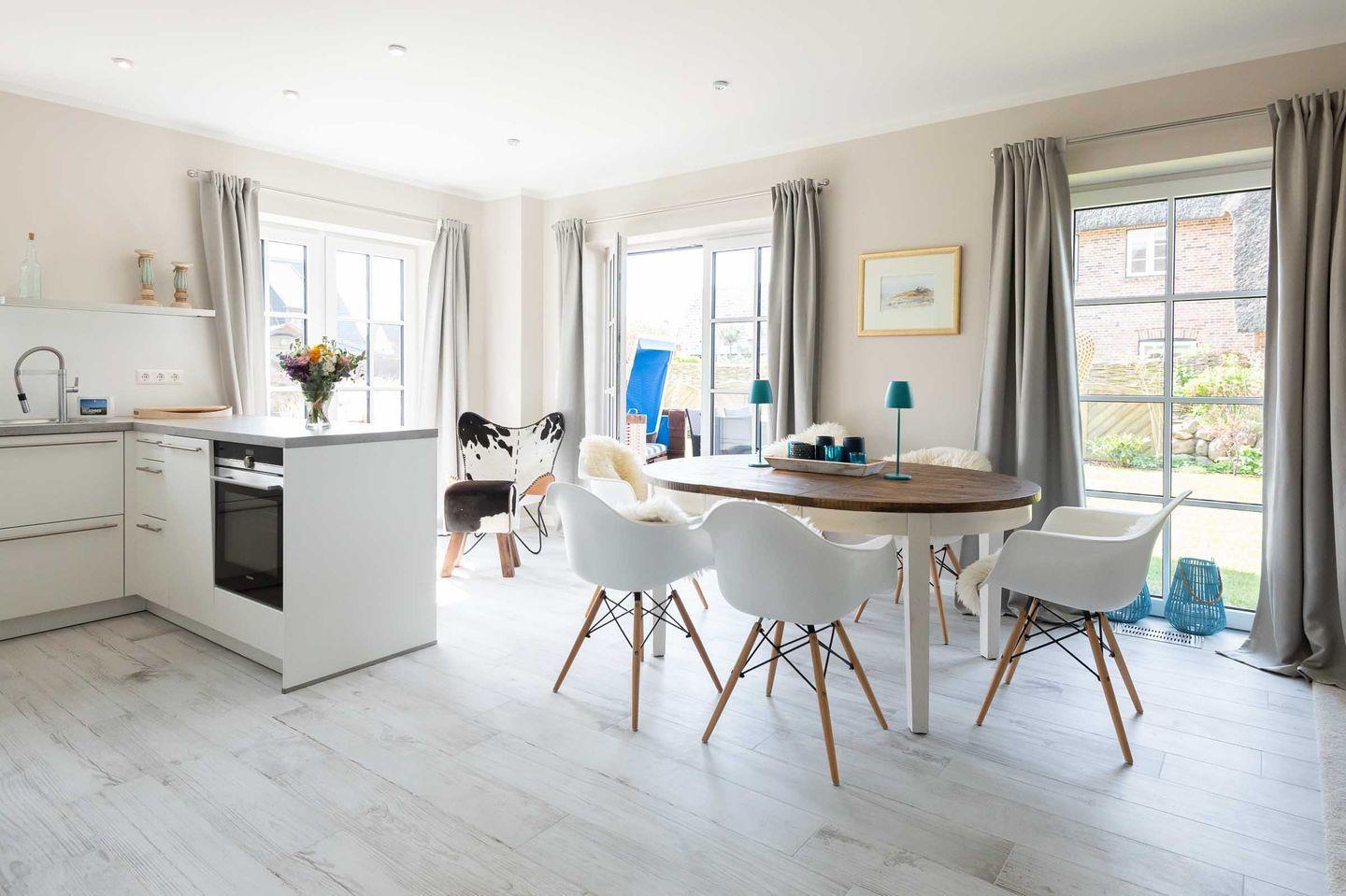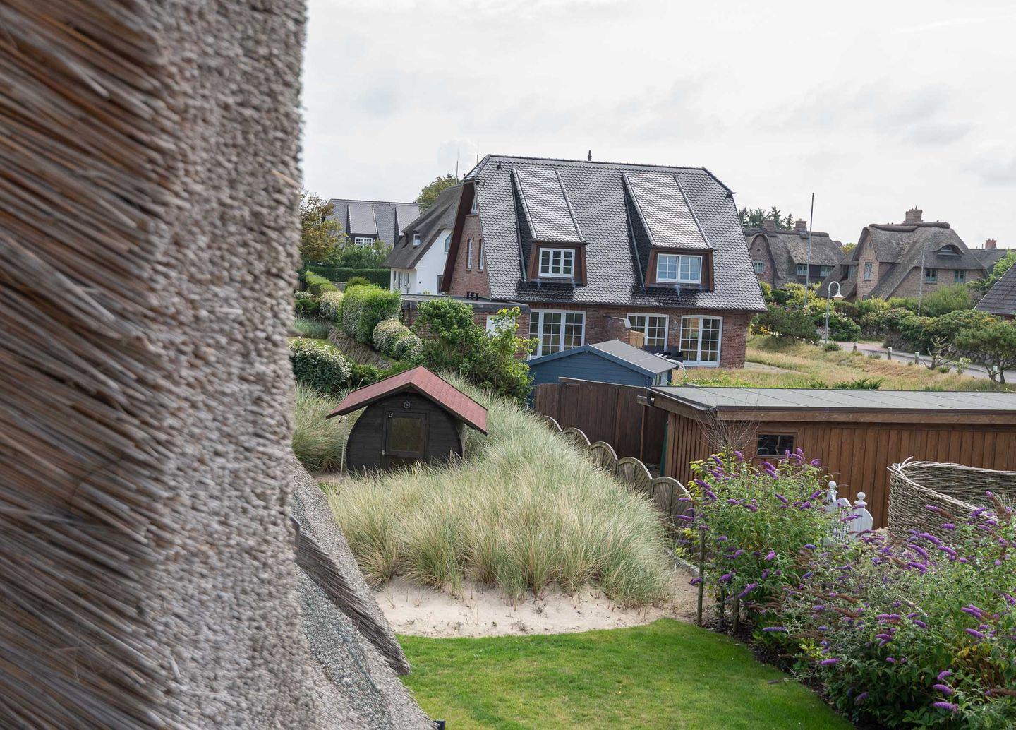 Die sehr wertig ausgestattete Küche mit BORA Herd und Kochfeldabzugssystem lässt für Hobby-Küche keine Wünsche offen. Ein heller und großzügiger Essbereich sowie eine gemütliche Sofaecke mit TV laden zum Verweilen ein. Von hier gelangen Sie in den neu angelegten Garten mit neu möblierter Süd-Terrasse, zwei Strandkörben und einer Außen-Sauna zur Eigennutzung, die in künstlich angelegter Dünenlandschaft liegt.