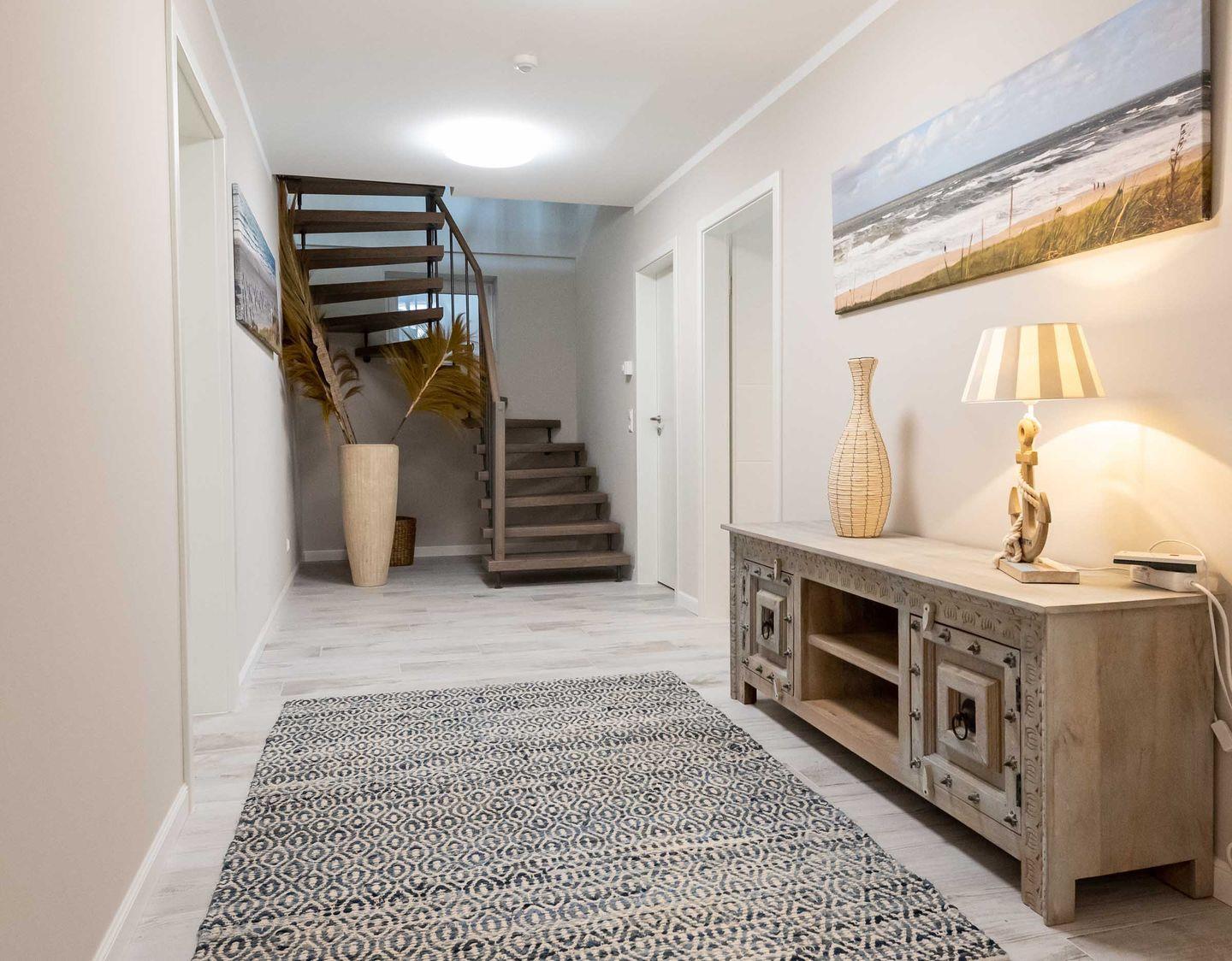 Über eine freitragende Treppe gelangen Sie in das modern eingerichtete Obergeschoss: