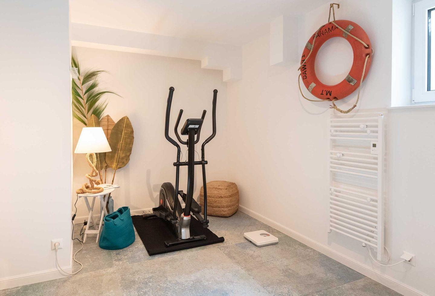 Badezimmer 2: Großzügiges maritimes Badezimmer mit bodengleicher Regendusche, Handtuchtrockner, Fenster und kleiner Fitness-Ecke mit Crosstrainer und Sportmatte.