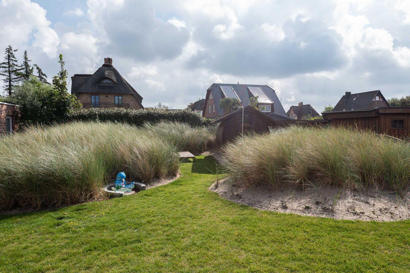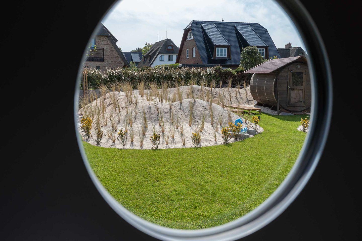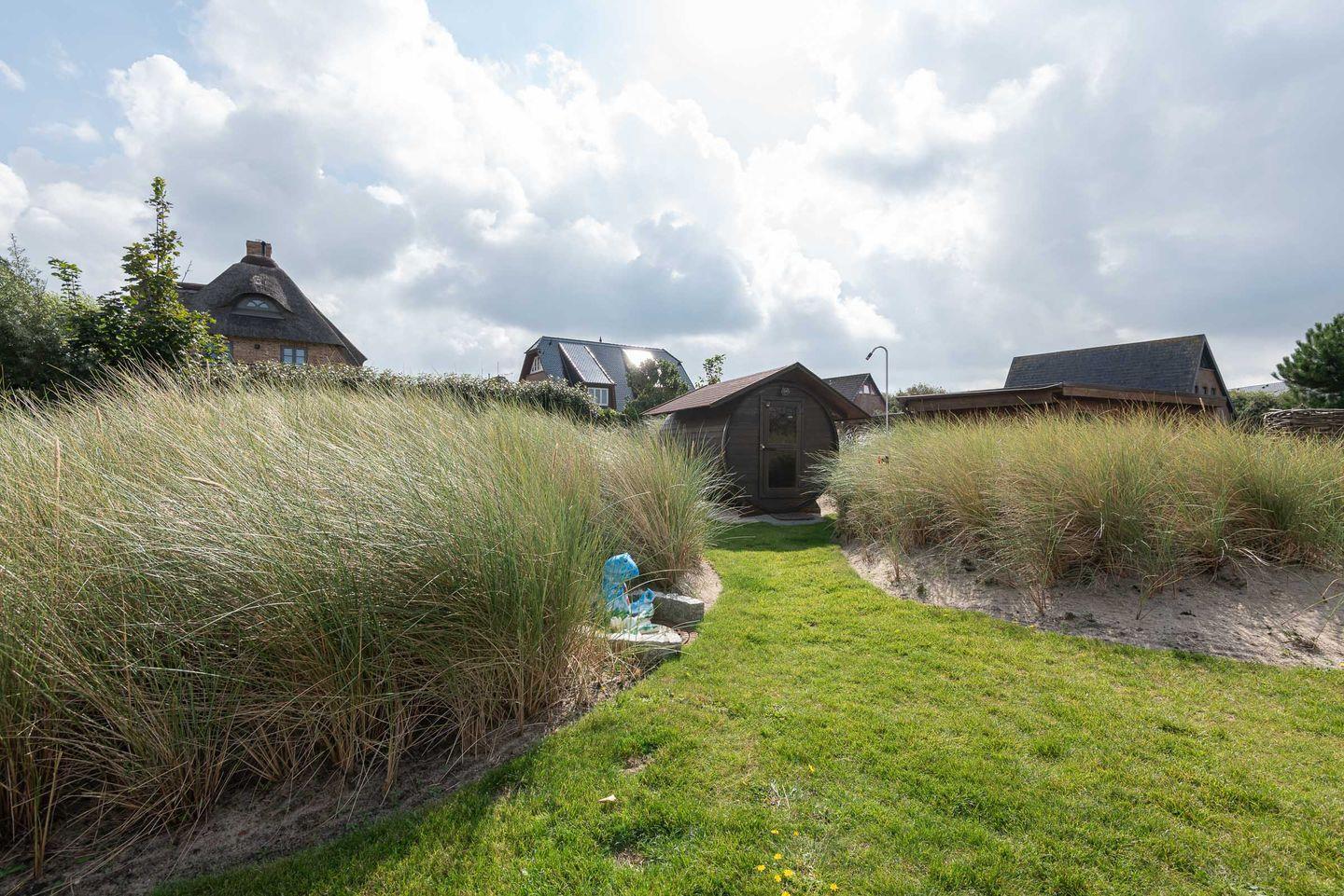 Garten: Das Doppelhaus steht auf einem neu angelegten Grundstück mit hochwertig möblierter Süd-Terrasse, zwei Strandkörben, Rasenfläche, Friesenwall und einer Außen-Sauna zur Eigennutzung, die sich inmitten einer künstlich angelegten Dünenlandschaft mit Liegewiese und Holzliegen befindet.