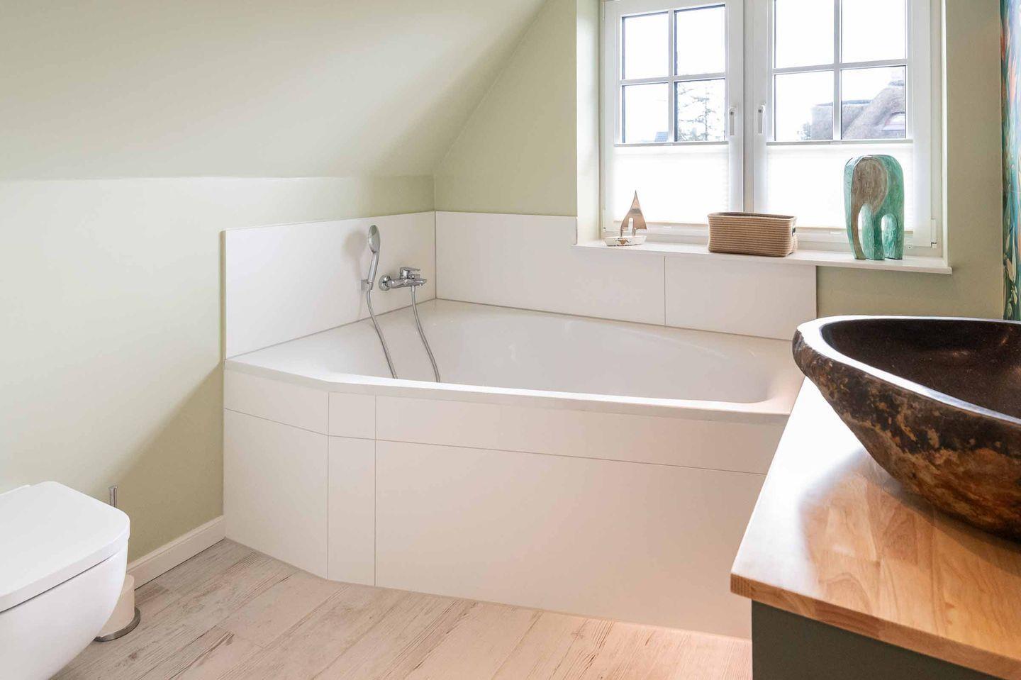 Badezimmer 1: Helles Badezimmer mit bodengleicher Regendusche, großer Badewanne, Handtuchtrockner und großem Fenster.
