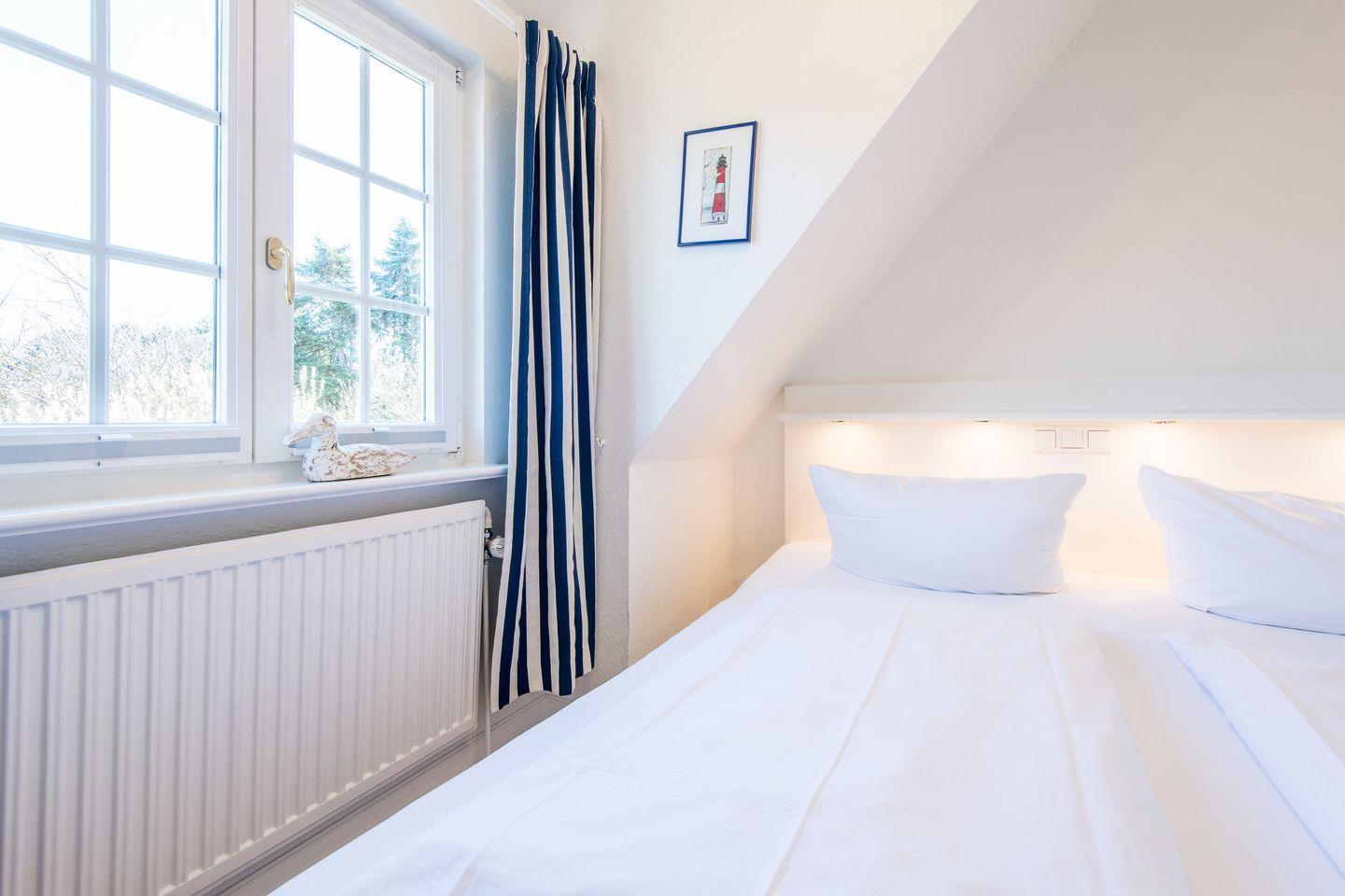 Schlafzimmer 2: Zwei Einzelbetten für Kinder unter Dachschrägen, Kleiderschrank und Fenster.