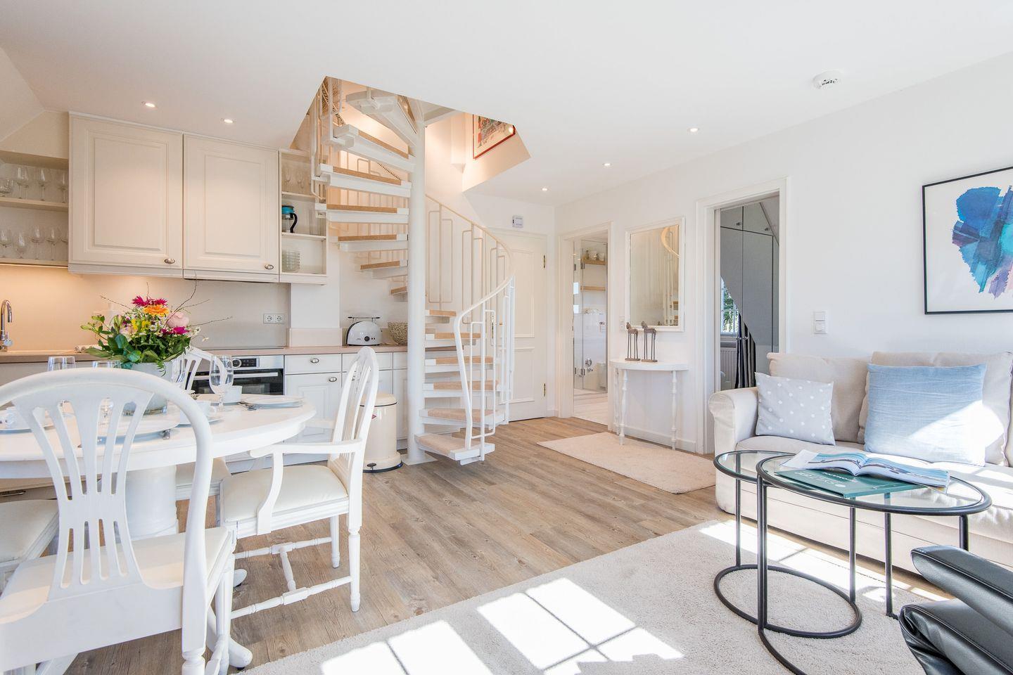 Im lichtdurchfluteten Obergeschoss befindet sich eine offene und gut ausgestattete Küche, die direkt an einen komfortablen Wohn- und Essbereich angrenzt: