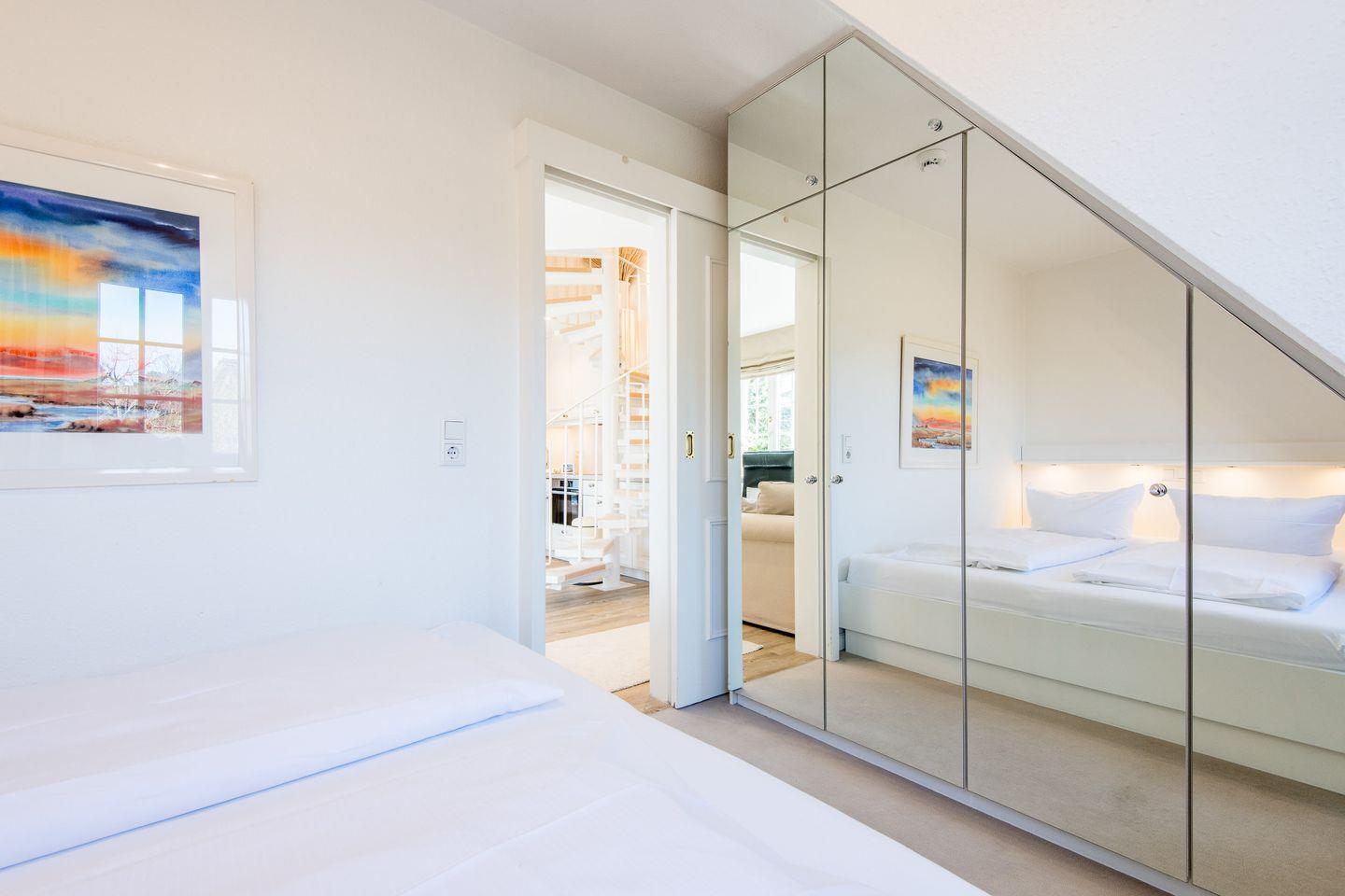 Schlafzimmer 1: Doppelbett, Einbauschrank und Fenster.