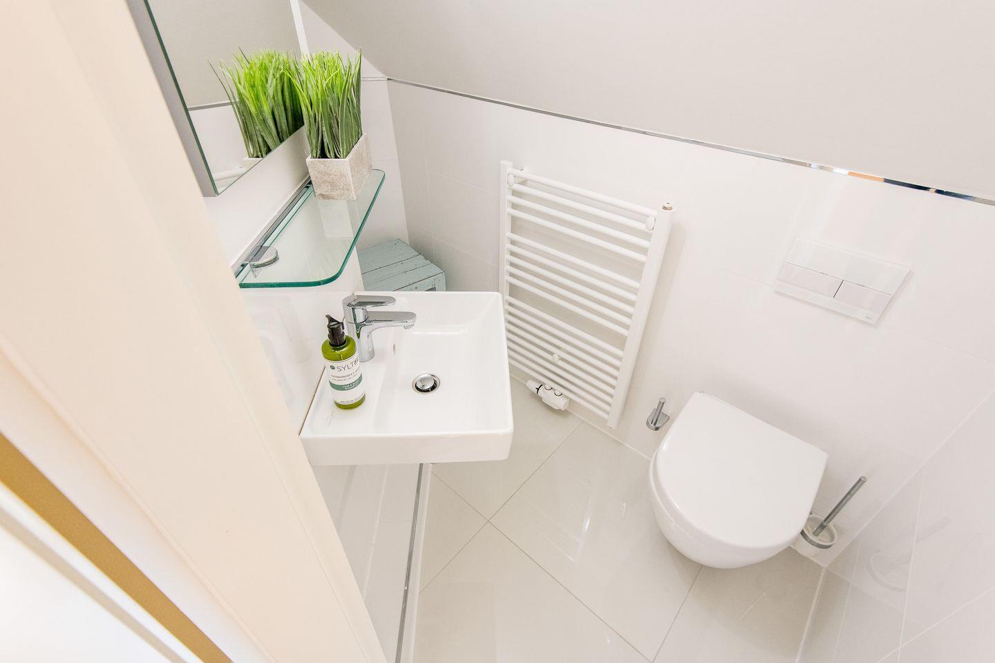 Gäste WC: Kleines und modernes Bad mit Fußbodenheizung, WC und Handtuchtrockner.