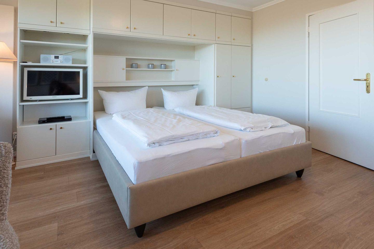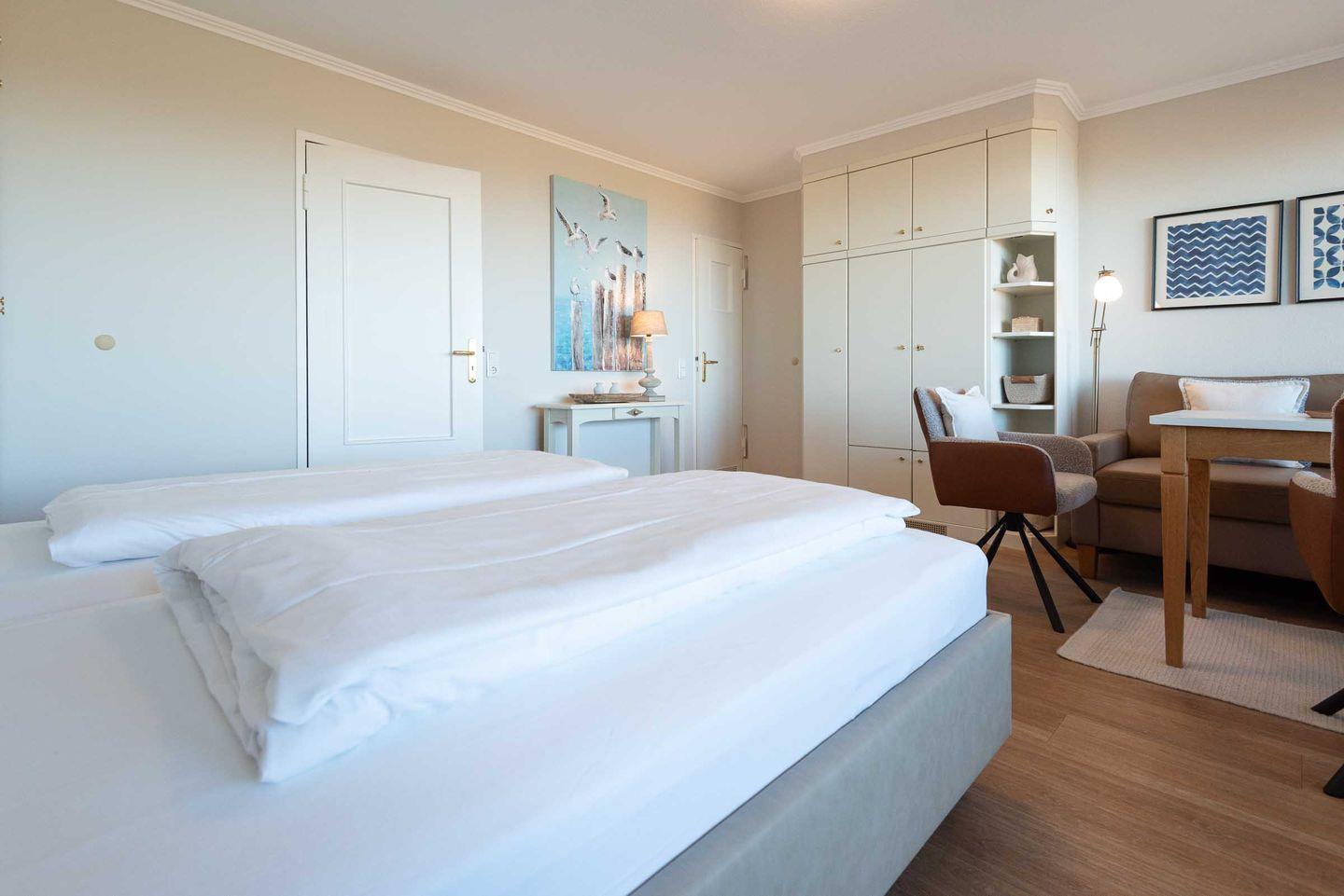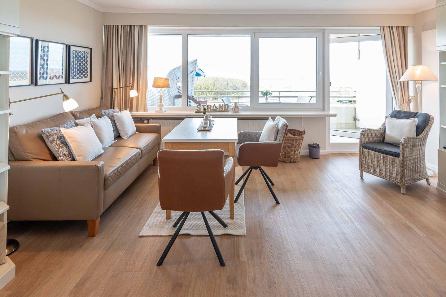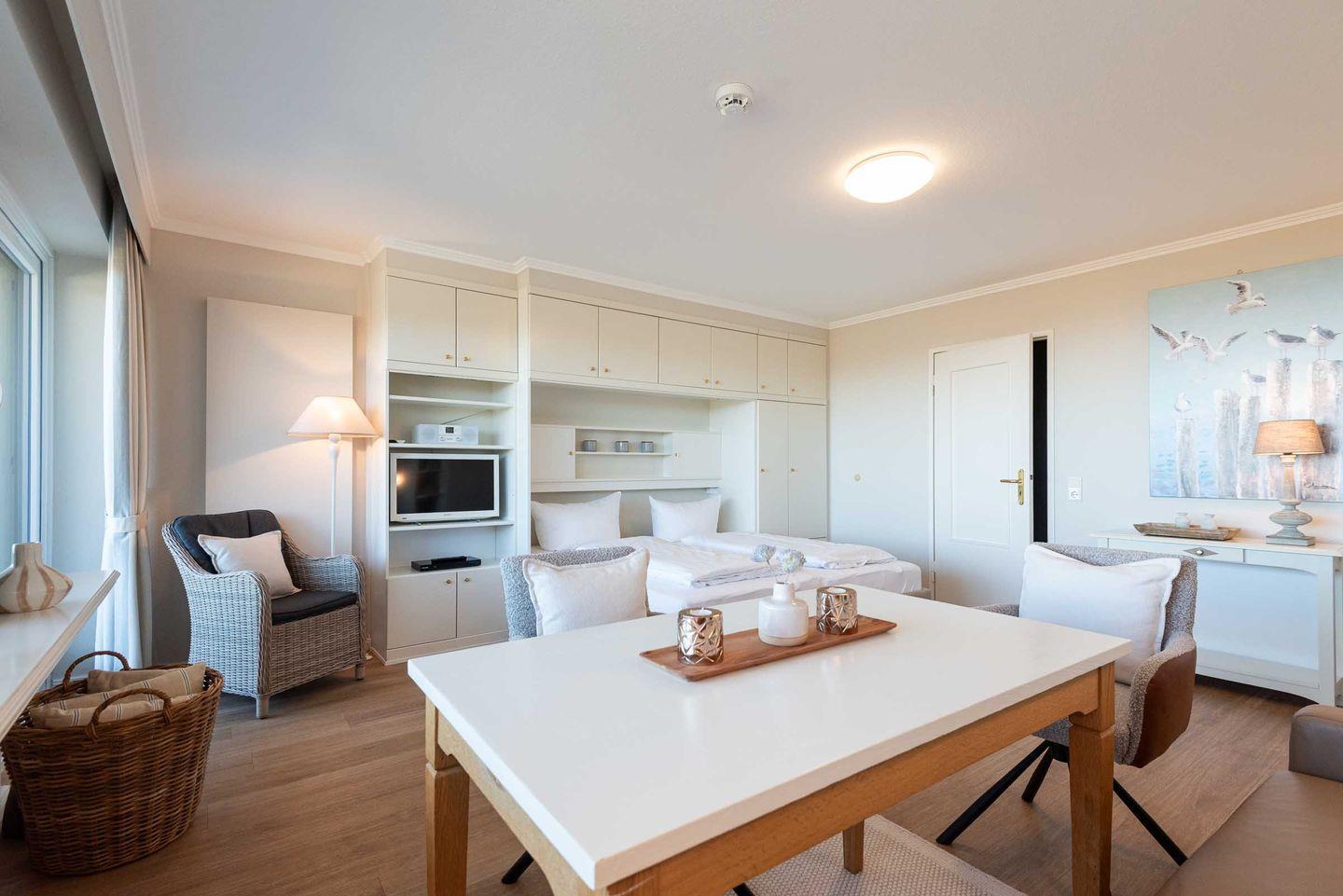 Wohn-/Ess- und Schlafbereich: Im Mittelpunkt des hellen Wohnraums steht ein gemütliches Sofa mit großem Esstisch und zwei bequemen Stühlen. Hier können Sie beim Essen und Lesen entspannte Stunden erleben und auf die Nordsee schauen. Flat-TV, Radio und Blue Ray Player stehen für Gäste zur Verfügung. In die Schrankwand im Wohnzimmer ist ein neues Doppelbett (März 2025) mit hochwertigen Matratzen (zwei 90 cm x 200 cm) integriert. Von Ihrem großzügigen möblierten Westbalkon mit Saison-Strandkorb blicken Sie direkt auf das Meer und genießen herrliche Sonnenuntergänge.