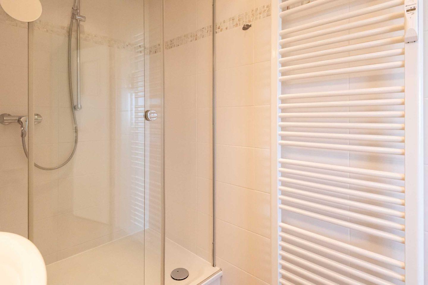 Badezimmer: Modernes Duschbad mit WC und elektrischem Handtuchhalter.