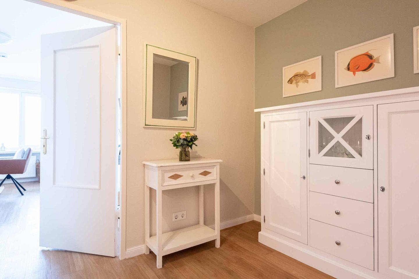 Küche und Flur: Helle, gut ausgestattete Pantryküche mit Spülmaschine, Backofen und Ceran-Kochfeld im Eingangsbereich. Der großräumige Flur bietet genügend Stauraum für Ihre Garderobe und Gepäckstücke.