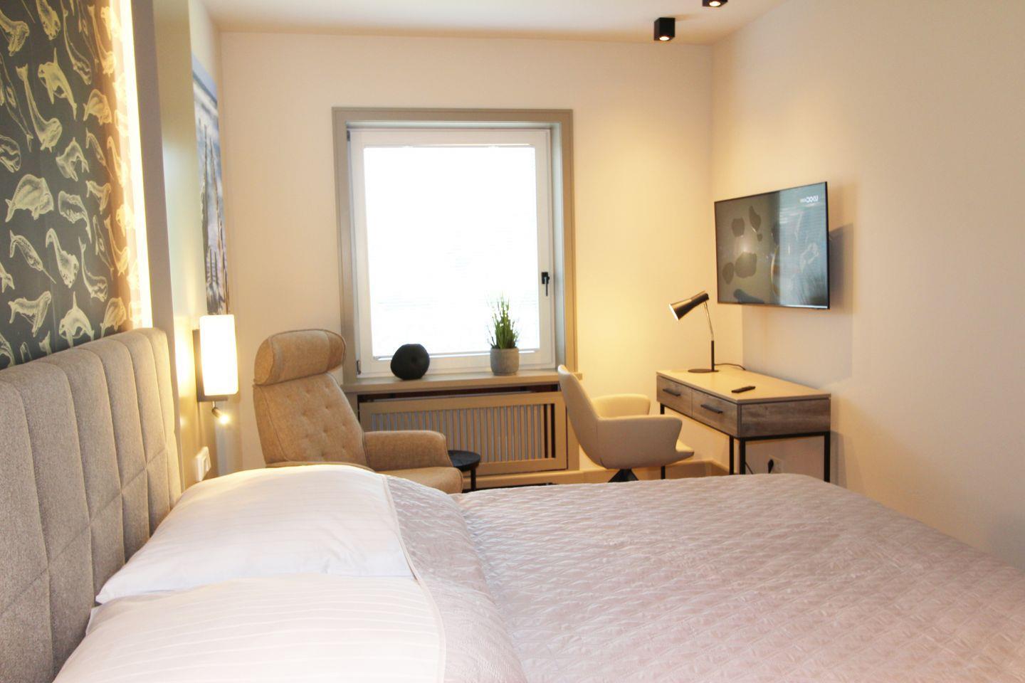Sie schlafen in einem komfortablen Doppelbett. Im Schlafzimmer befinden sich zudem ein zweites TV-Gerät und ein bequemer Sessel, der zum Verweilen einlädt.