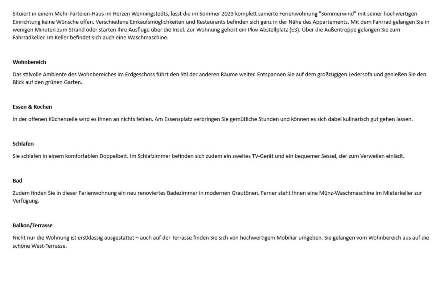 Situiert in einem Mehr-Parteien-Haus im Herzen Wenningstedts, lässt die im Sommer 2023 komplett sanierte Ferienwohnung "Sommerwind" mit seiner hochwertigen Einrichtung keine Wünsche offen. Verschiedene Einkaufsmöglichkeiten und Restaurants befinden sich ganz in der Nähe des Appartements. Mit dem Fahrrad gelangen Sie in wenigen Minuten zum Strand oder starten Ihre Ausflüge über die Insel. Zur Wohnung gehört ein Pkw-Abstellplatz (E3). Über die Außentreppe gelangen Sie zum Fahrradkeller. Im Keller befindet sich auch eine Waschmaschine.