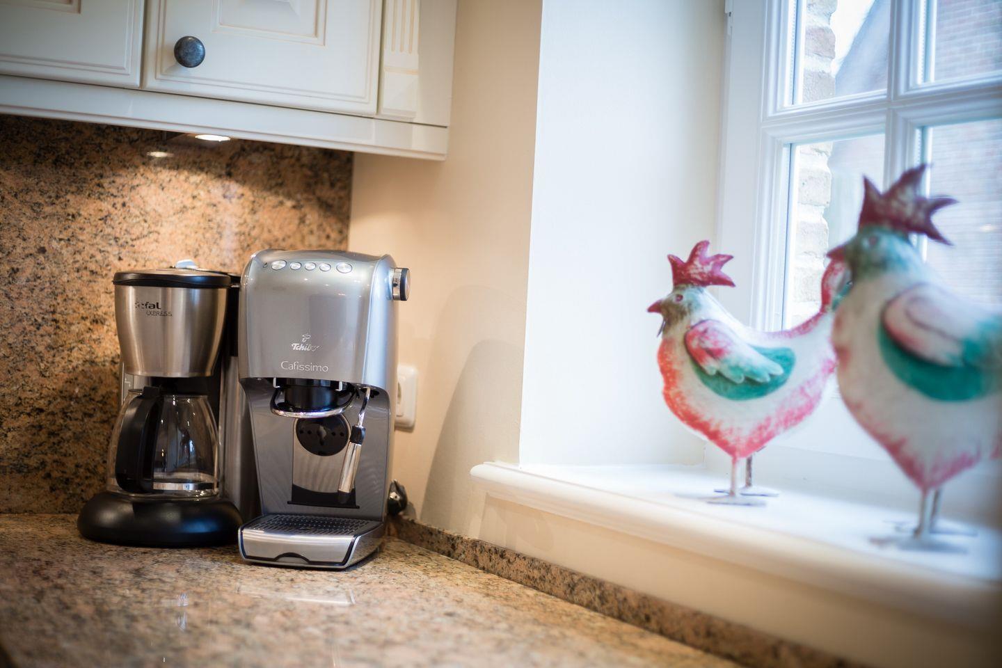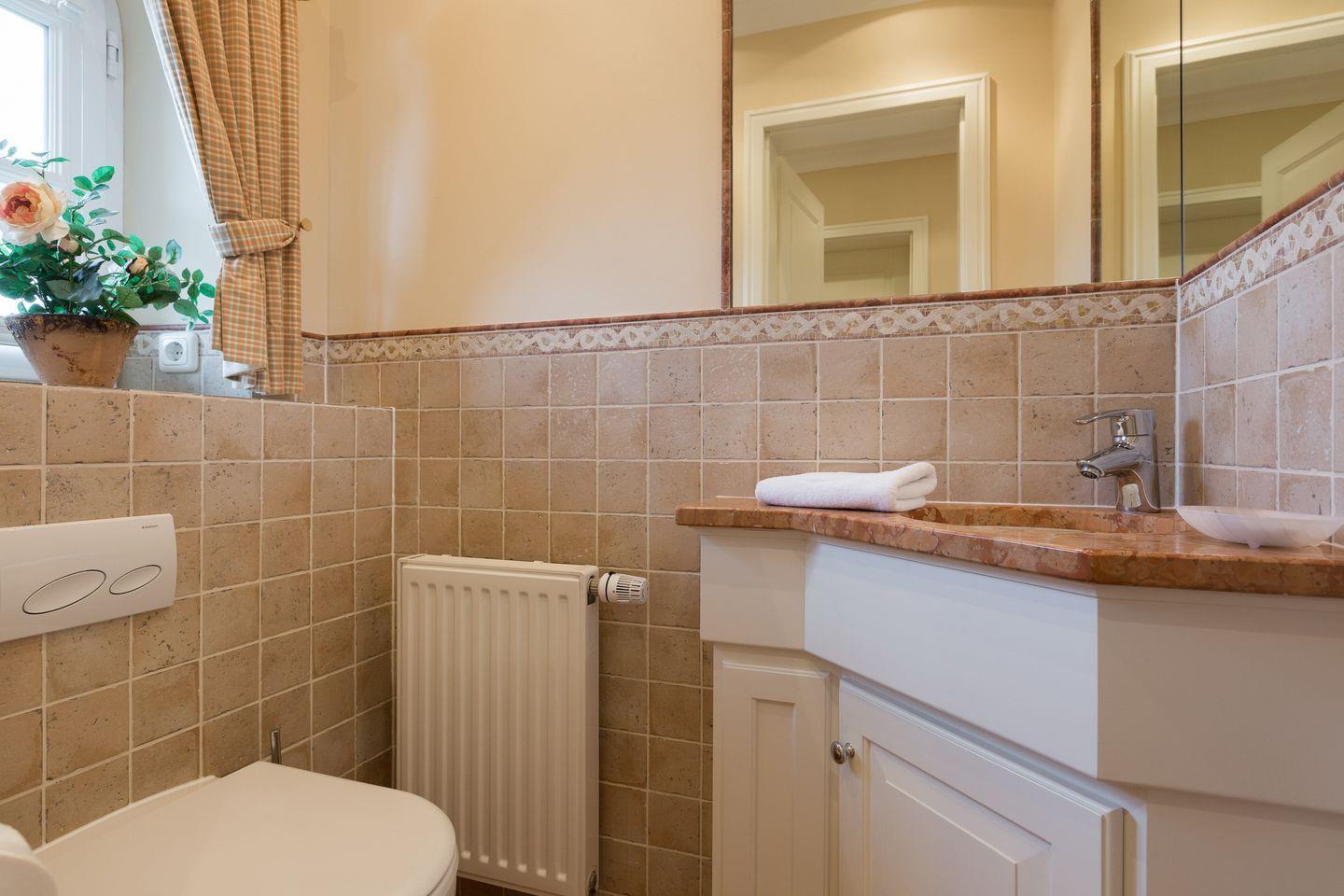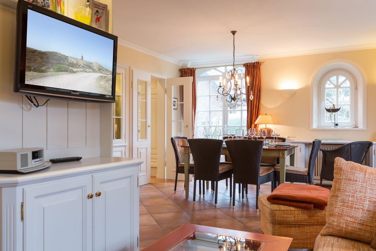 EG: Wohnraum mit Flatscreen-TV, DVD-Player, CD-Player, Telefonflatrate ins deutsche Festnetz und Radio, antiker Kachelofen, Essbereich für sechs Personen, integrierte Küche mit Geschirrspülmaschine, Backofen, Wasserkocher und Kaffeemaschine, Gartenterrasse mit Strandkorb (ca. April-Oktober) und hochwertigen Gartenmöbeln, Gartenhaus. Gäste WC separat vorhanden.