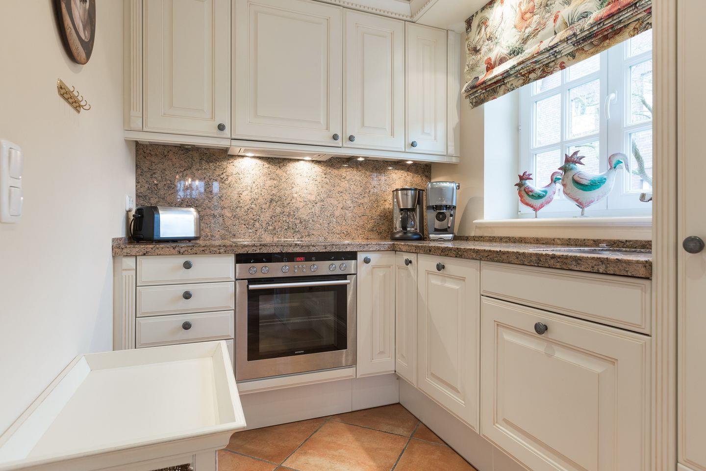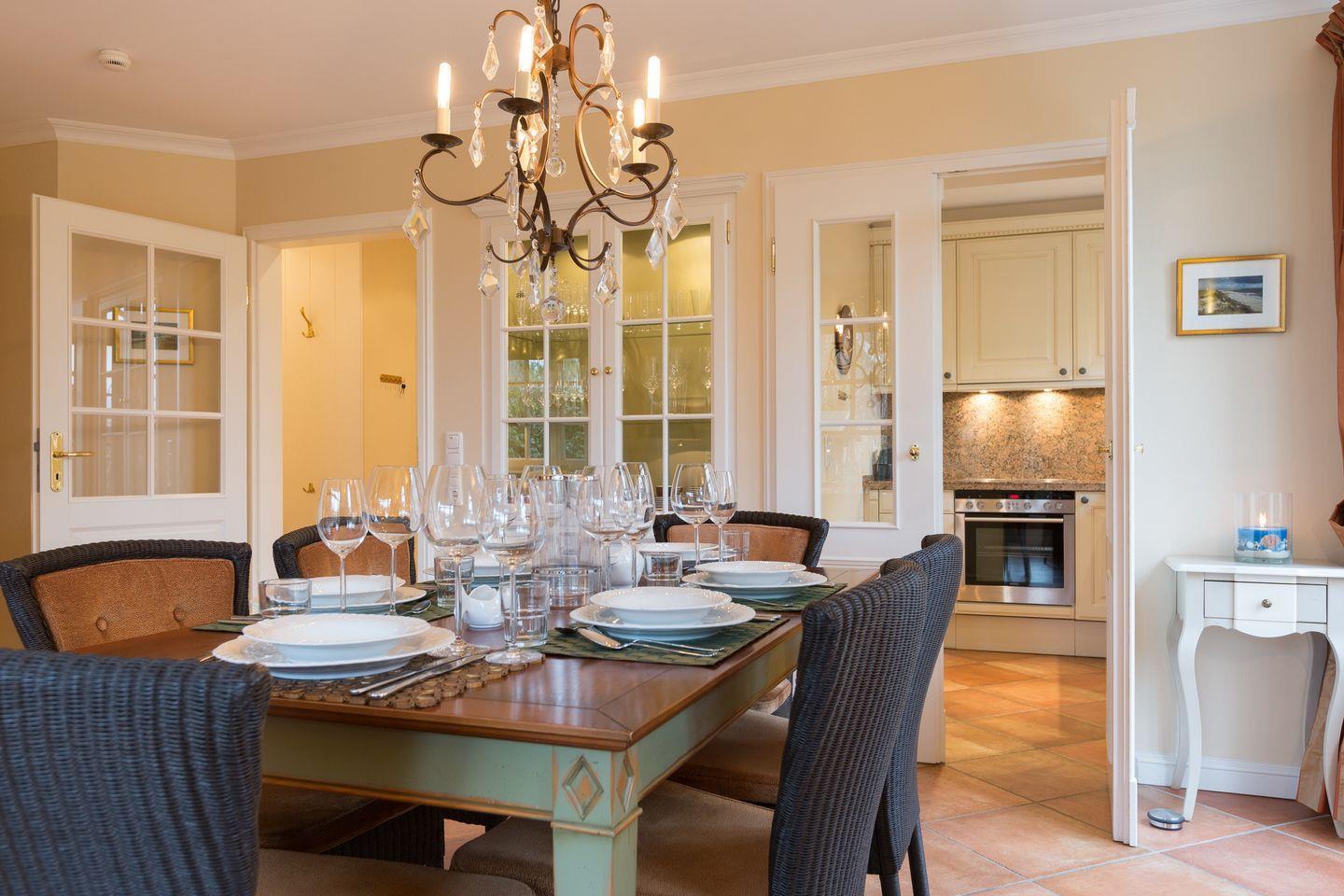 Im großen Wohnbereich erwartet Sie eine geschmackvolle Einrichtung. Vom gemütlichen Sofa aus schauen Sie auf den antiken Kachelofen und der Essbereich bietet genügend Platz für bis zu sechs Personen. Die Küche ist geschickt durch eine Glastür vom Wohnbereich getrennt und bietet Ihnen mit ihrer vollen Ausstattung alles, was Ihr Urlaubsherz begehrt.