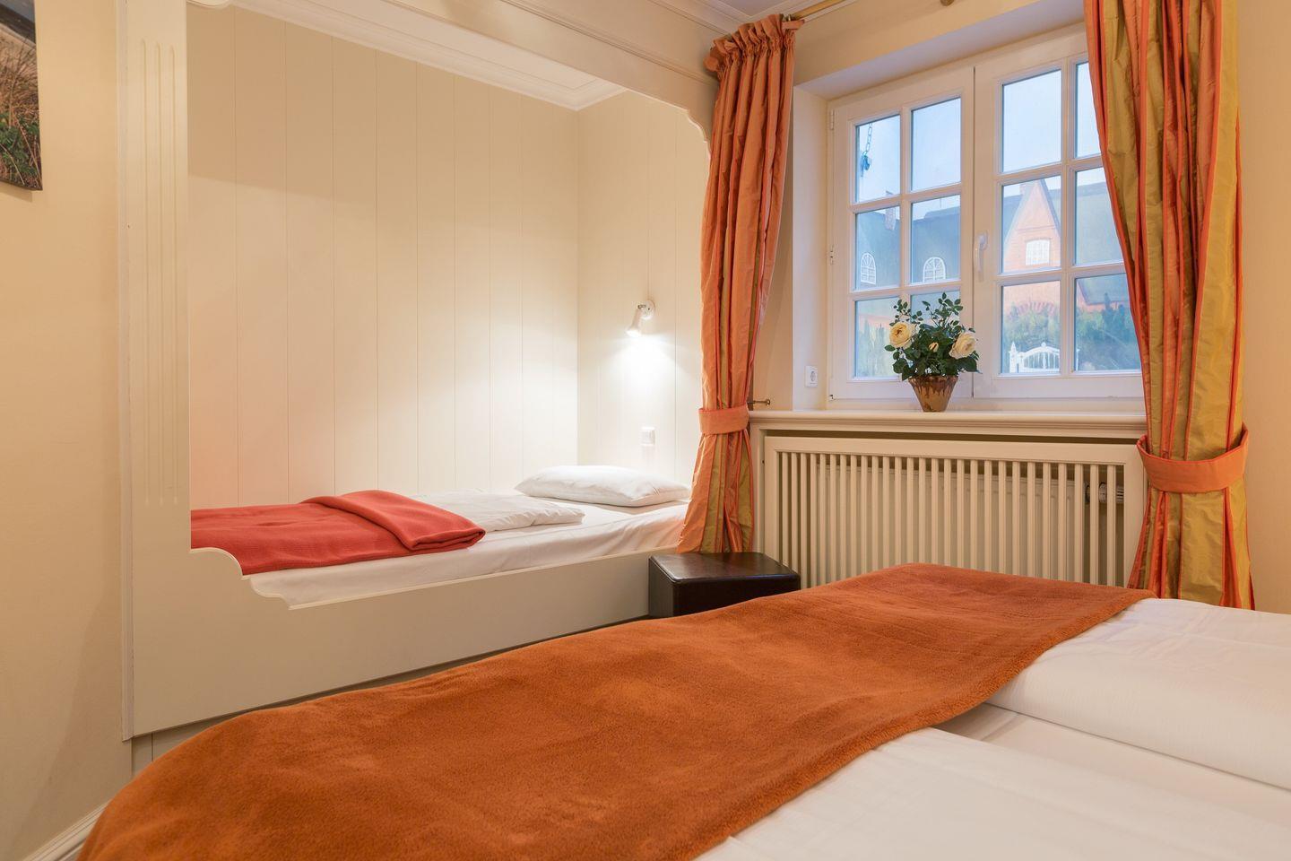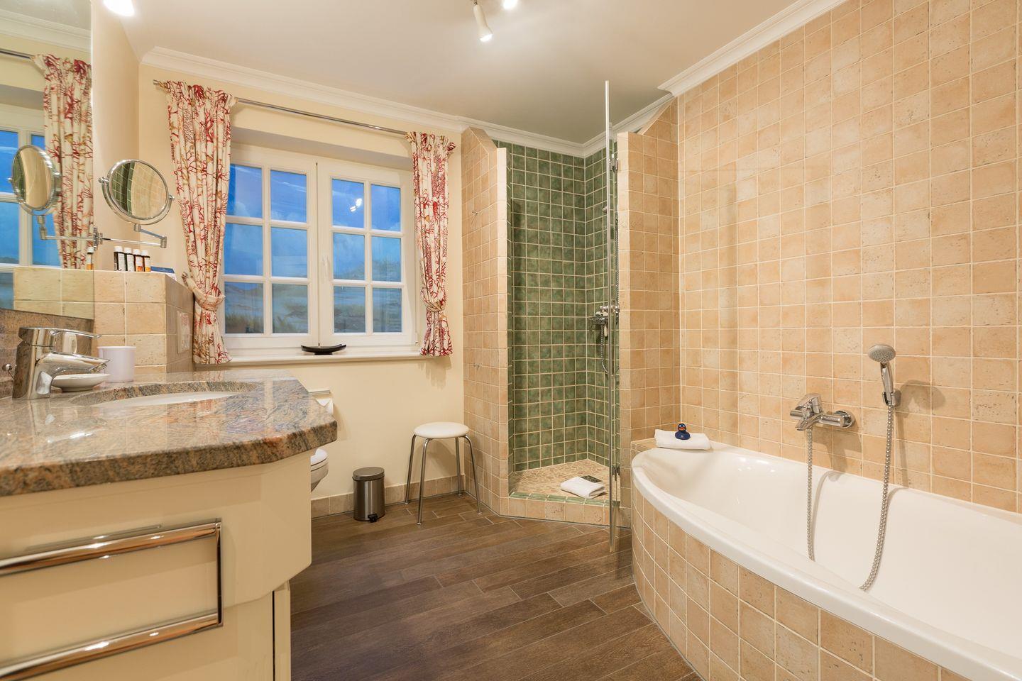 Im Untergeschoss der Wohnung befinden sich zwei gemütliche Räume mit jeweils einem Doppelbett. In einem der Räume finden Sie außerdem ein weiteres Einzel-Kojenbett, in dem sich vor allem ein Kind sicherlich wohlfühlen wird. Auf gleicher Ebene bietet Ihnen das Domizil ein Wohlfühlbadezimmer mit Sauna, Dusche und WC sowie ein weiteres Badezimmer mit Badewanne, Dusche und WC.