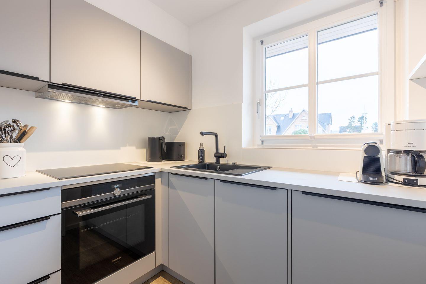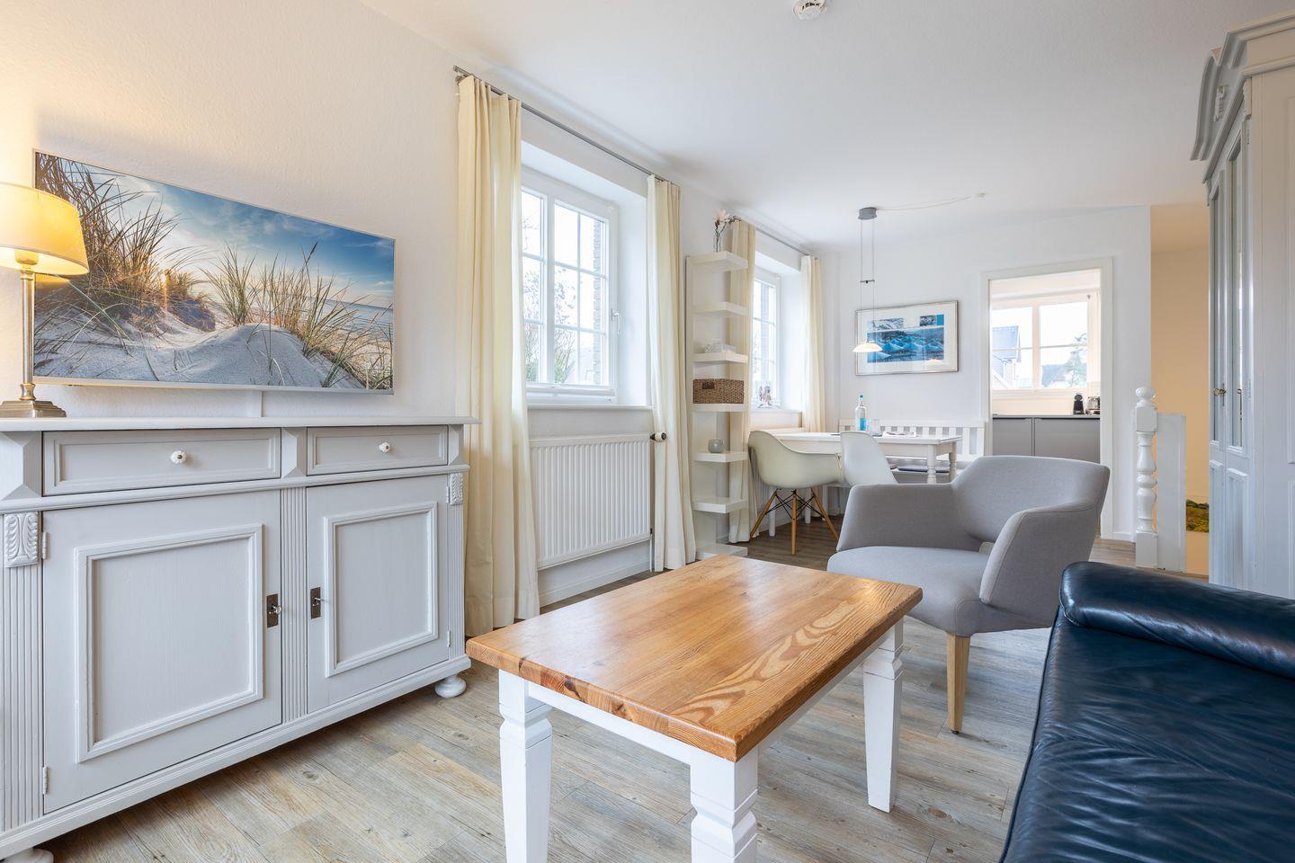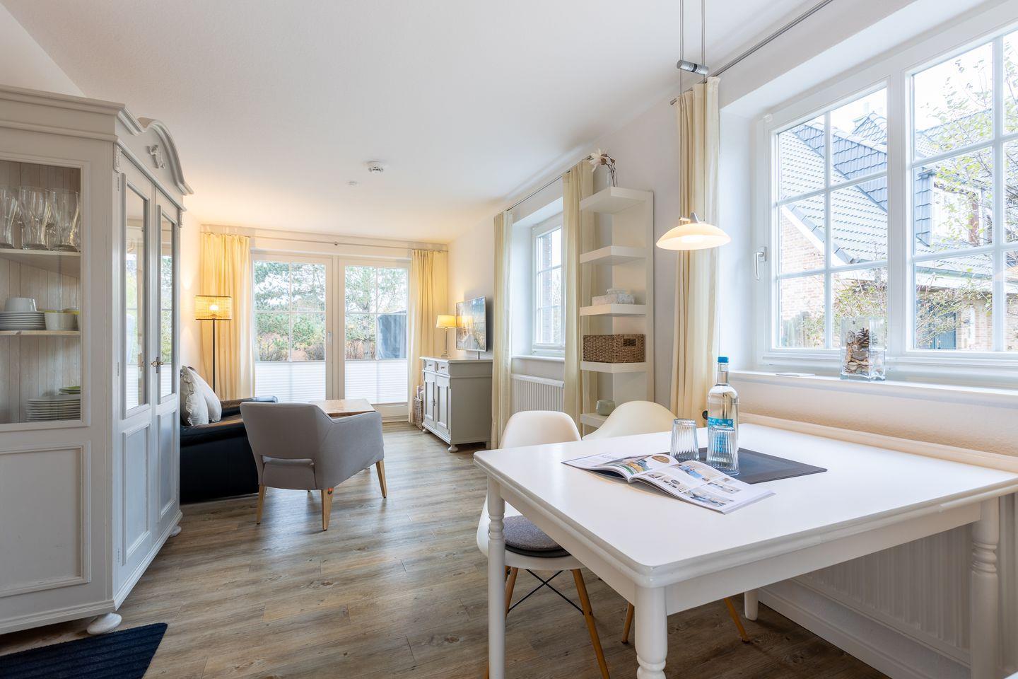 Der helle und modern gestaltete Wohnraum des Domizils bietet Ihnen eine Couchecke mit zwei Sesseln, einen Essbereich für bis zu drei Personen sowie eine neue separate Küche, die direkt an den Essbereich grenzt. Vom Wohnbereich aus betreten Sie Ihre wunderschöne, möblierte Süd-Terrasse mit Blick in den idyllischen Garten. Die Sonne können Sie hier bis in die Abendstunden ausgiebig genießen.