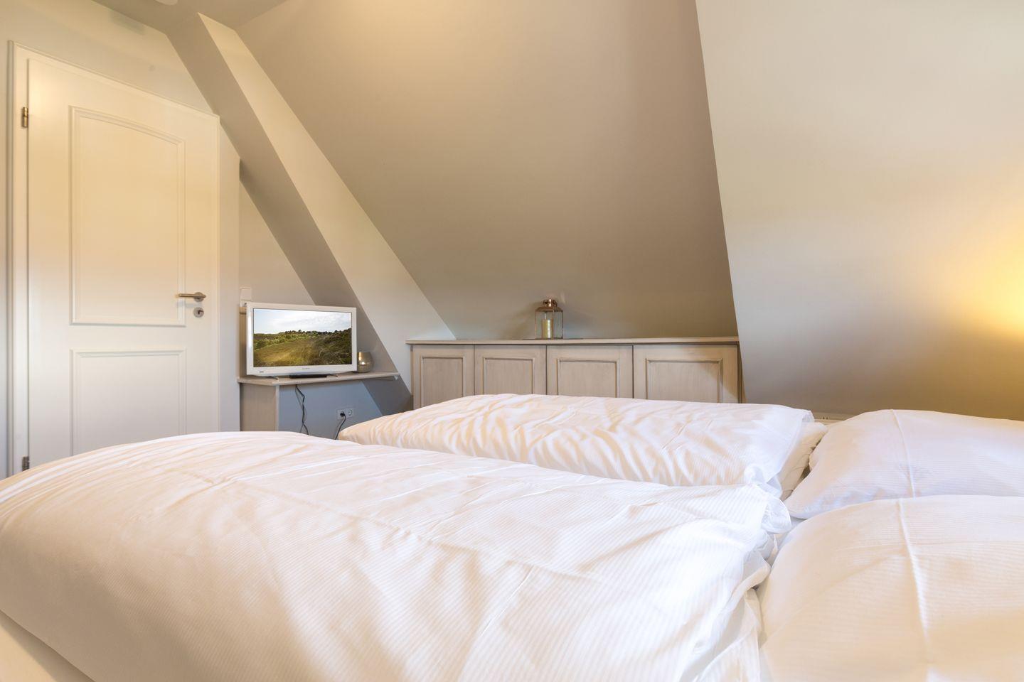 DG: 1 Raum mit Doppelbett (180x200), TV. West-Balkon mit Blick auf die Dünen. Waschmaschine und -Trockner im Haus.