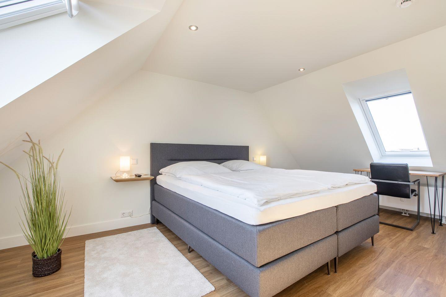Von hier führt eine recht steile Treppe ins Dachgeschoss, wo sich das gemütliche Schlafzimmer mit Boxspringbett