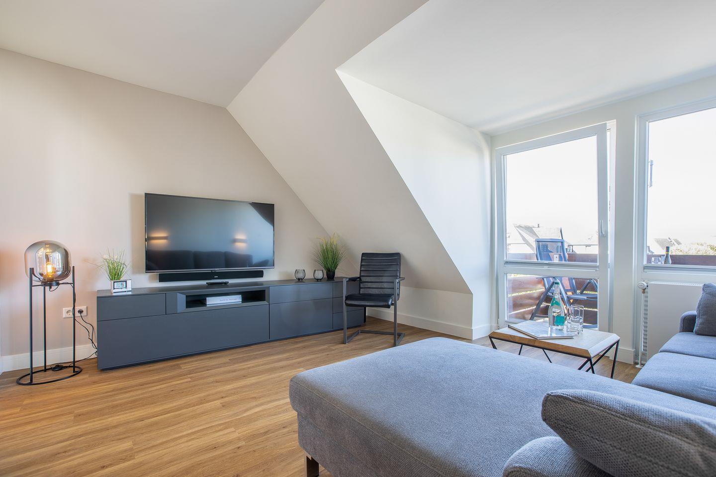 OG: Wohnraum mit Flatscreen-TV und Heos-Soundsystem; Balkon mit Balkonmöbeln; offene Küche mit
