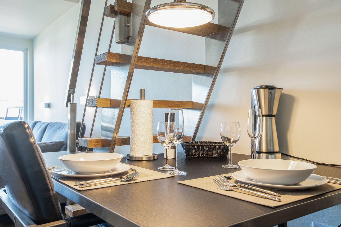 Die Ferienwohnung Quartier 18 ist eine schicke kleine Wohlfühloase, die sich über zwei Etagen erstreckt. Auf der