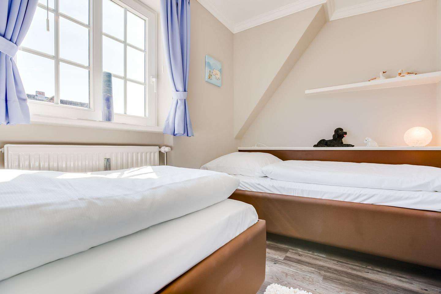 OG: 1 Schlafraum mit Doppelbett (90x200cm, 180cm Bett). 1 Schlafraum mit 2 Betten (90x200cm). Dusche/WC.