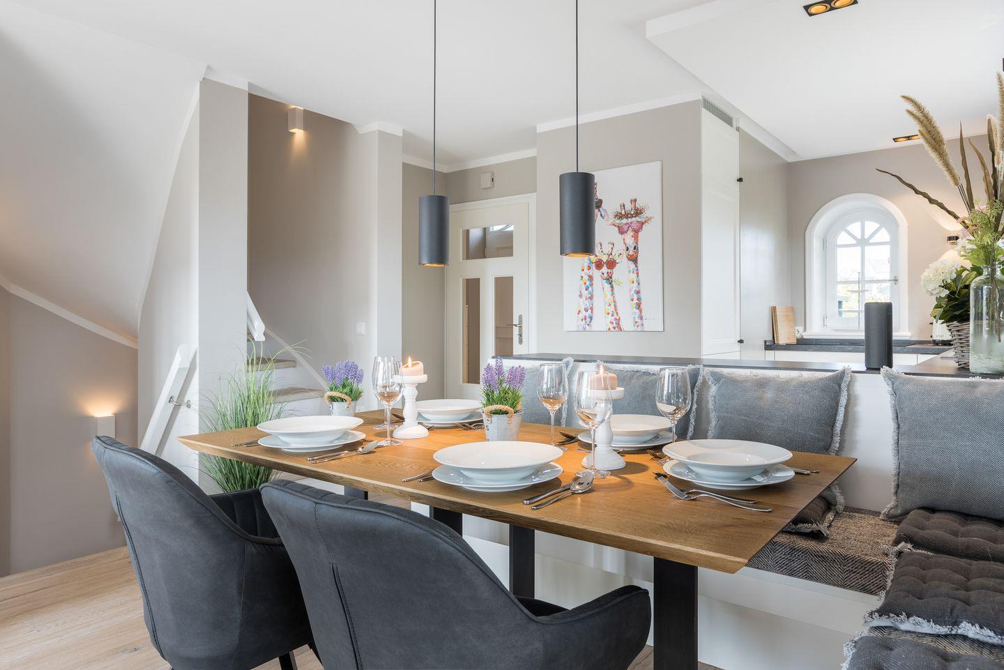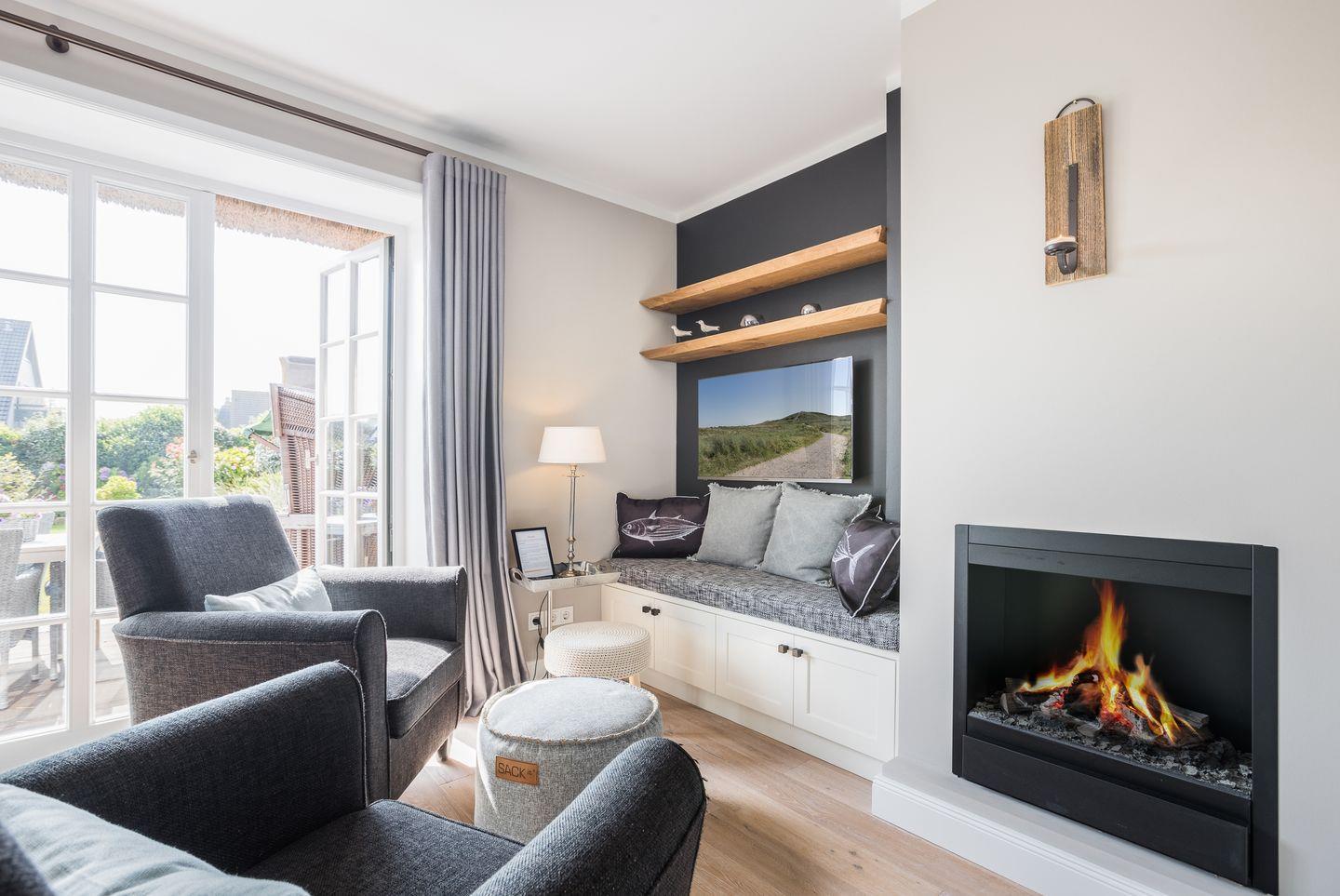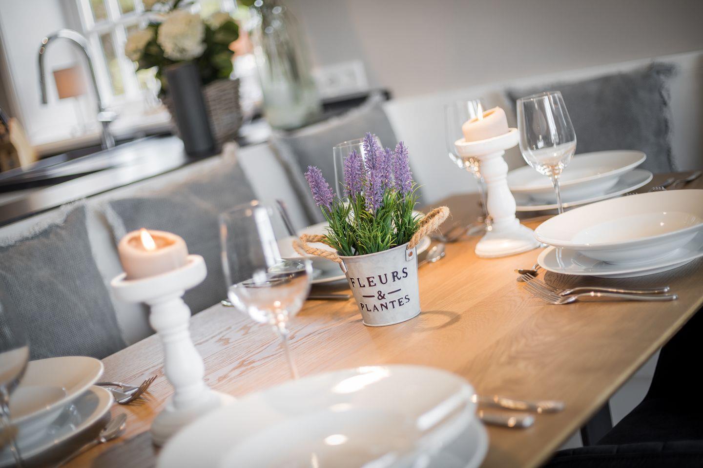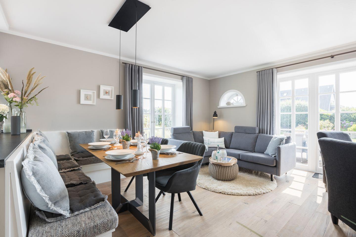Der helle Wohnraum erwartet Sie mit einer stilvollen Einrichtung und bodentiefen Fenstern, die schon den Blick auf den schönen Garten freigeben. Entspannen Sie sich am Elektro-Kamin oder genießen Sie Ihr Familiendinner am großen Esstisch. Das Ferienhaus verfügt über einen schön angelegten Garten mit Terrasse, die in der Saison mit Strandkorb und Gartenmöbeln ausgestattet ist. In der offenen Küche wird es Ihnen ausstattungstechnisch an nichts fehlen. Von der Nespresso-Maschine über ein Induktionskochfeld bis hin zur Geschirrspülmaschine ist hier alles vorhanden, was Sie zum Zaubern in der Küche benötigen. Auf gleicher Ebene zum Wohnbereich finden Sie außerdem ein Gäste-WC.