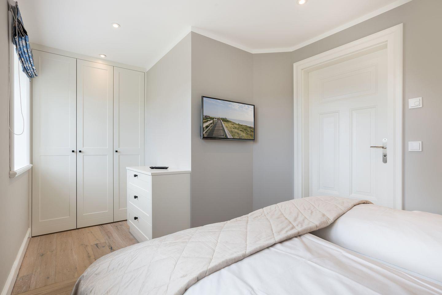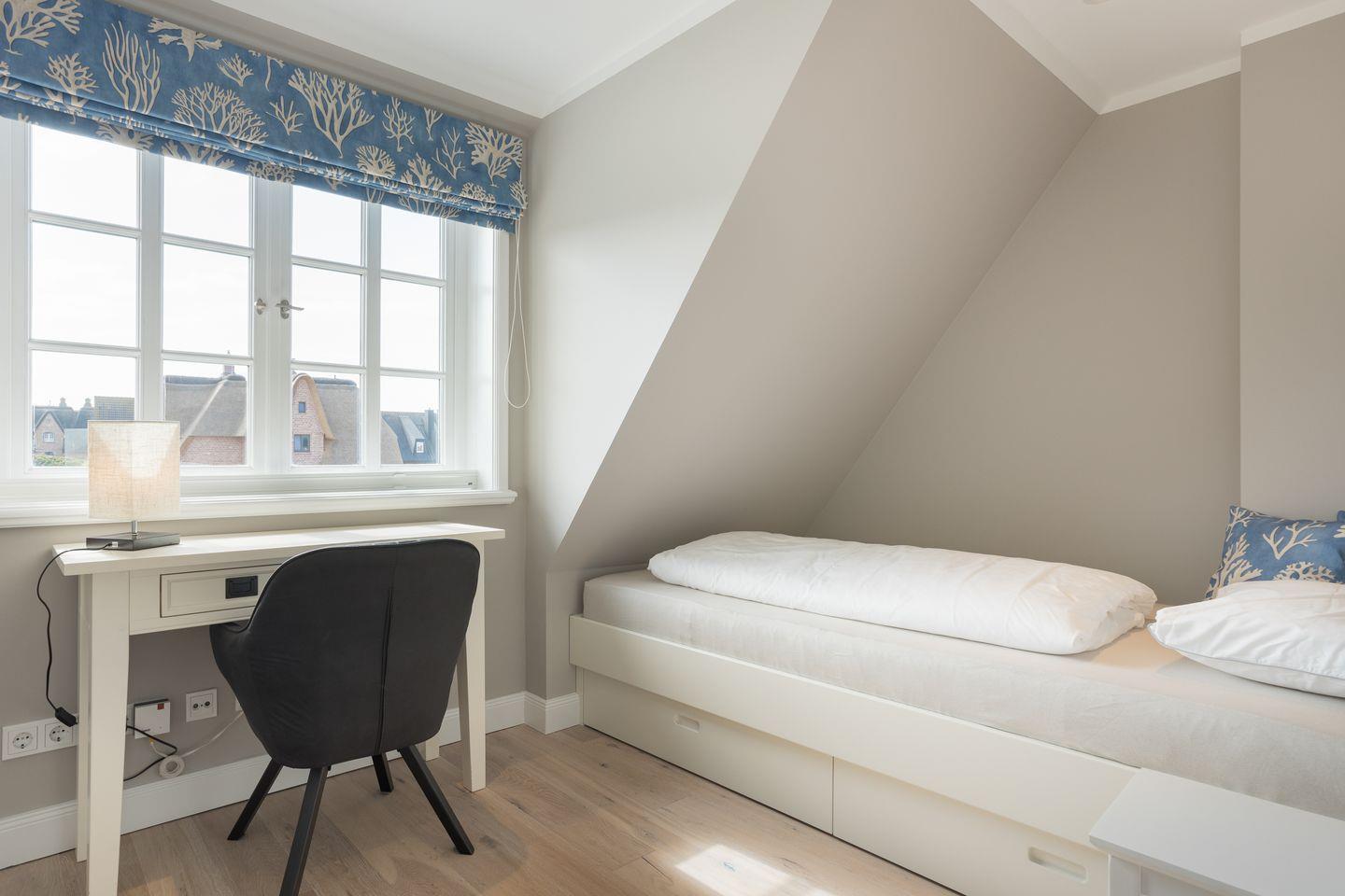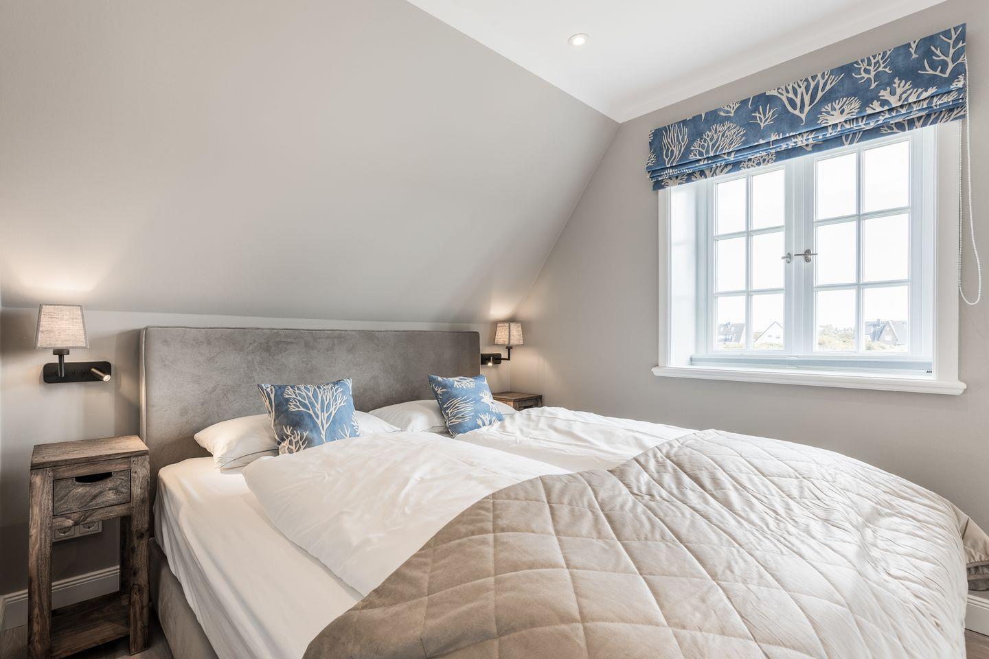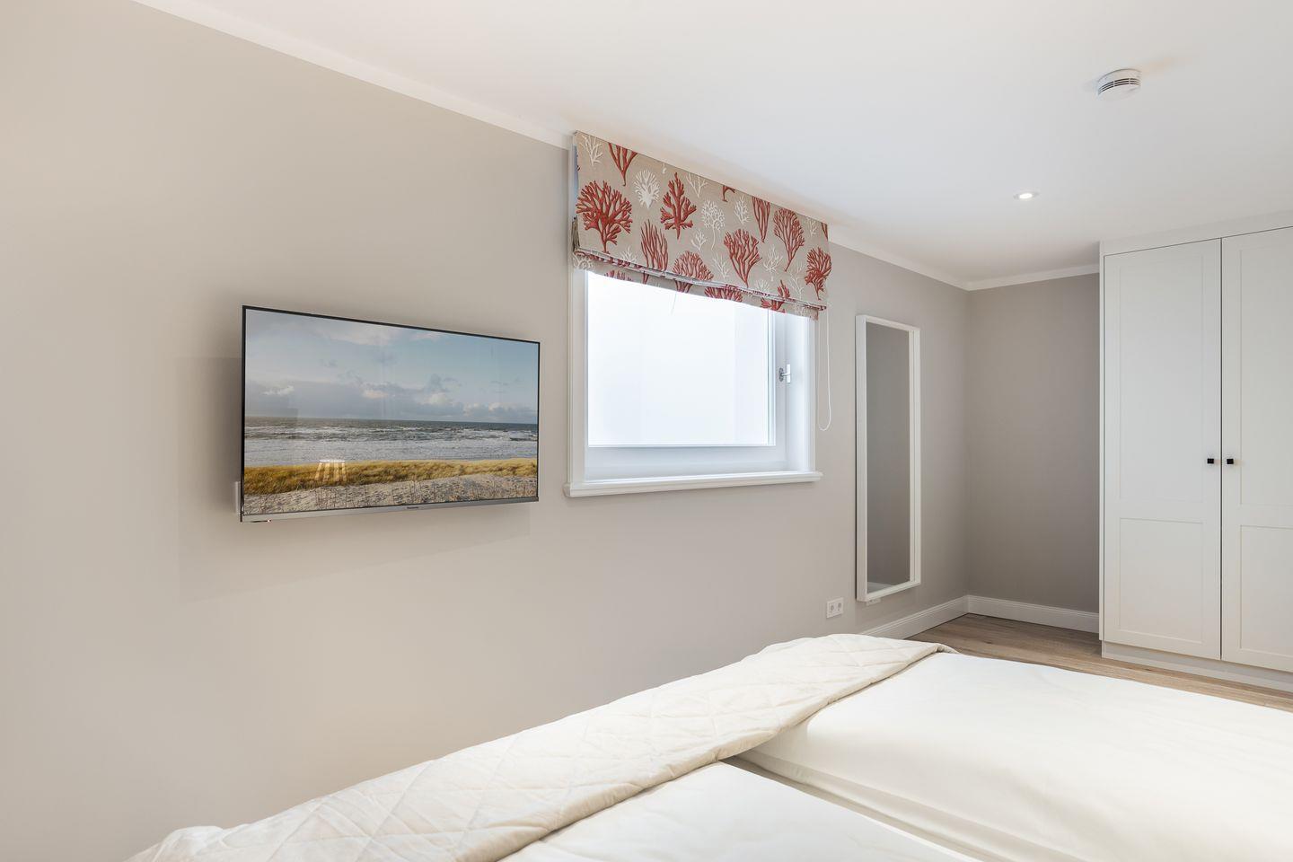 Im Untergeschoss des Hauses erwarten Sie zwei Räume mit je einem Doppelbett und Flatscreen-TV sowie ein Badezimmer mit Dusche und WC. Das Badezimmer bietet Ihnen außerdem eine kleine, private Sauna, die Ihnen die kalten Tage auf Sylt sicherlich versüßen wird. Im Obergeschoss finden Sie ein weiteres Schlafzimmer mit Doppelbett und Flatscreen-TV und einen Schlafraum mit Einzelbett und kleinem Schreibtisch. Auch auf dieser Ebene bietet Ihnen das Haus ein Badezimmer mit Dusche und WC.