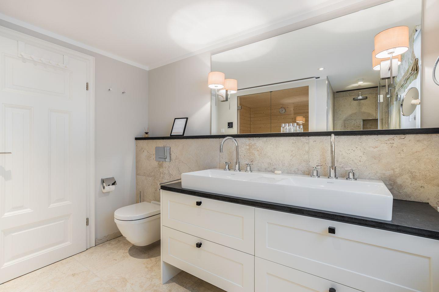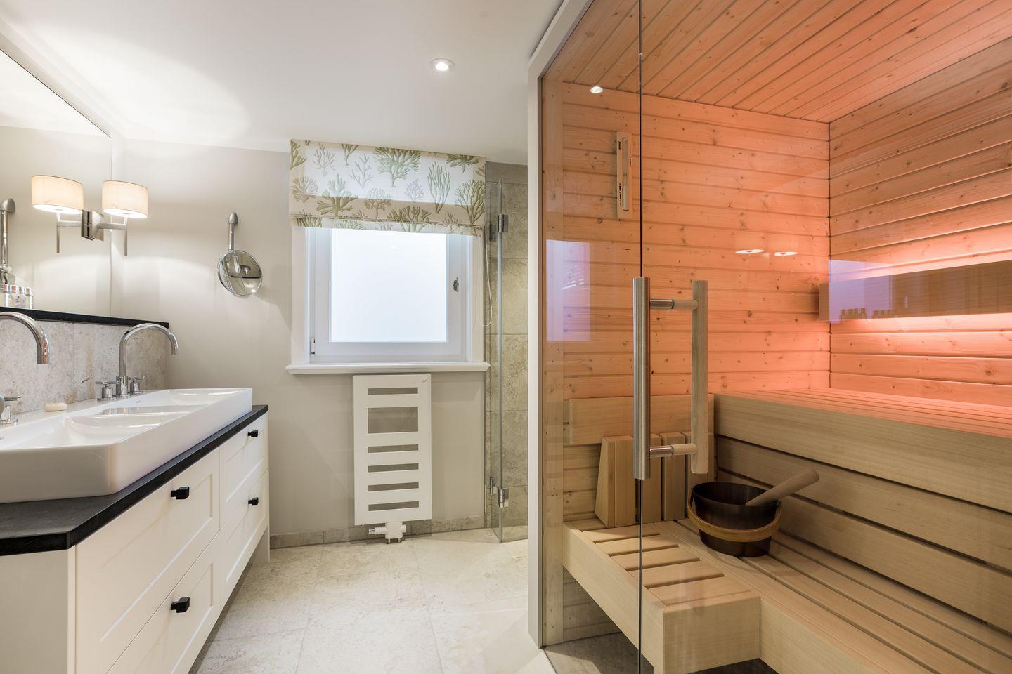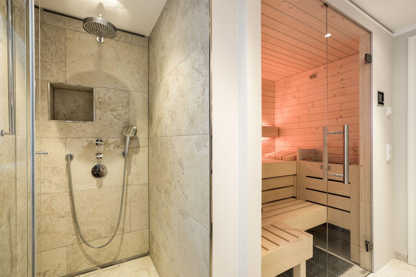 UG: zwei Räume mit je einem Doppelbett (180x200cm) und Flatscreen-TV, Duschbad mit Sauna