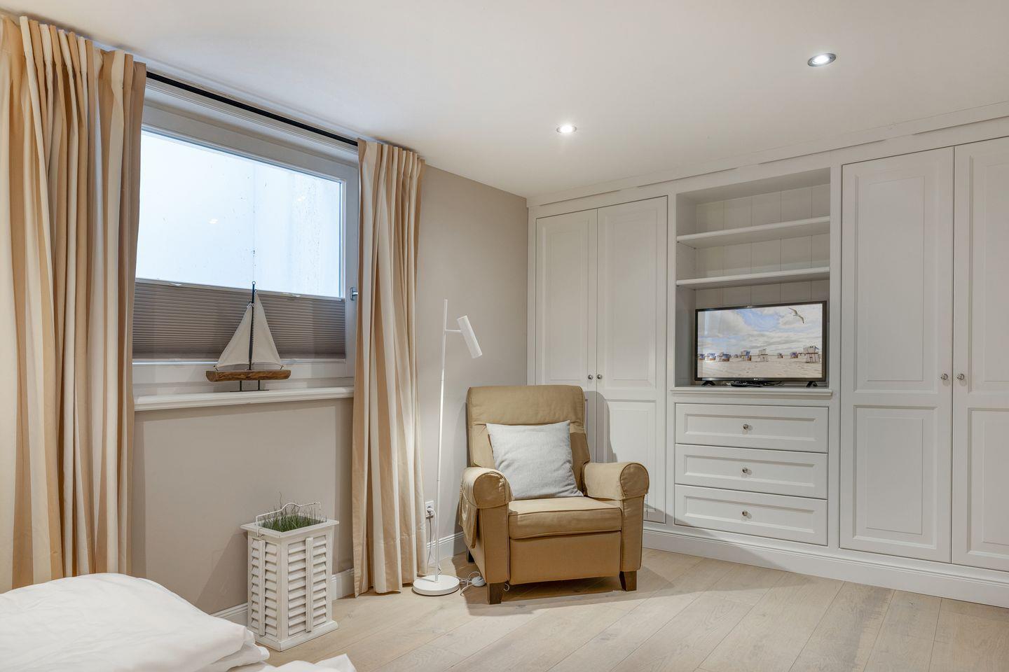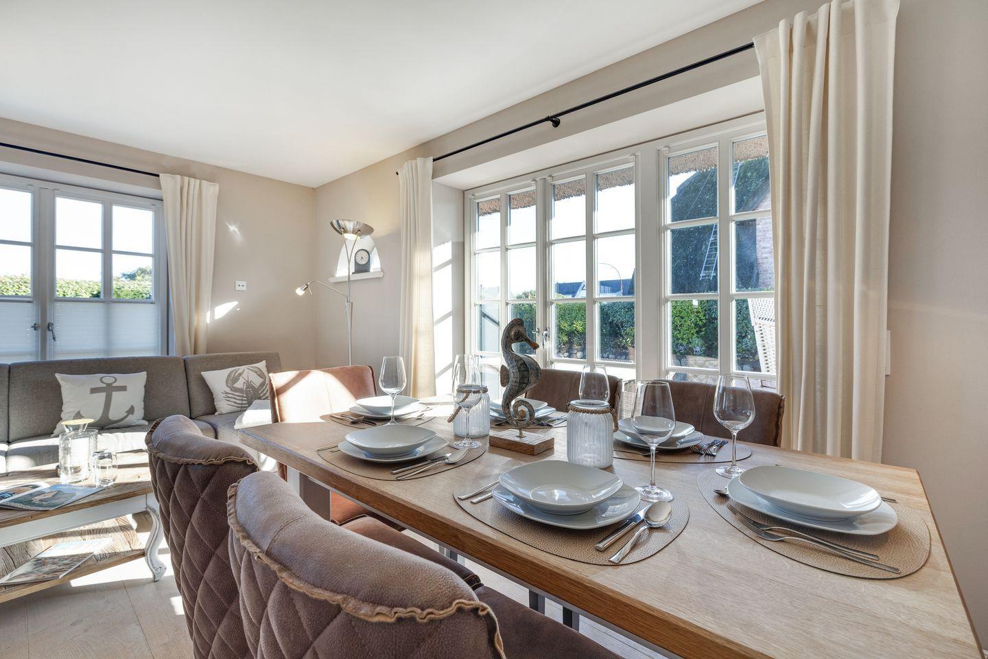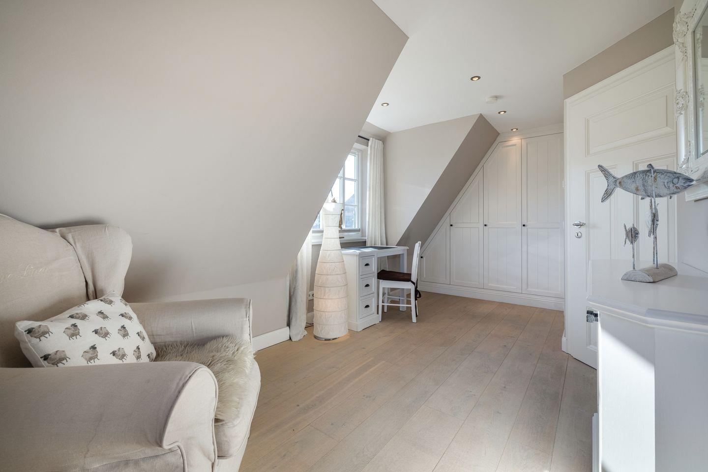 Freuen Sie sich auf dieses Entrée: luftig und sonnig empfängt Sie Ihr Erdgeschossbereich. Die edlen, gekalkten Eichendielen umschmeicheln Ihre Füße und schaffen eine fantastische Wohlfühlatmosphäre. Ihr schöner Eichen-Esstisch ist das Herz Ihres feinen Domizils. Mit der in den Raumbereich integrierten, eindrucksvollen Küche würde bestimmt auch ein sternedekorierter Spitzenkoch vorlieb nehmen. Backofen und Geschirrspüler verstehen sich von selbst. Ihr kuscheliger Wohnbereich lässt Sie Ihren Smart-TV genießen. Ihr antiker Mylin-Kachelofen verströmt Sylter Heimeligkeit pur. WLAN und ein Radio stehen Ihnen selbstverständlich zur Verfügung, wie auch ein Gäste-WC im Eingangsbereich vorhanden ist.