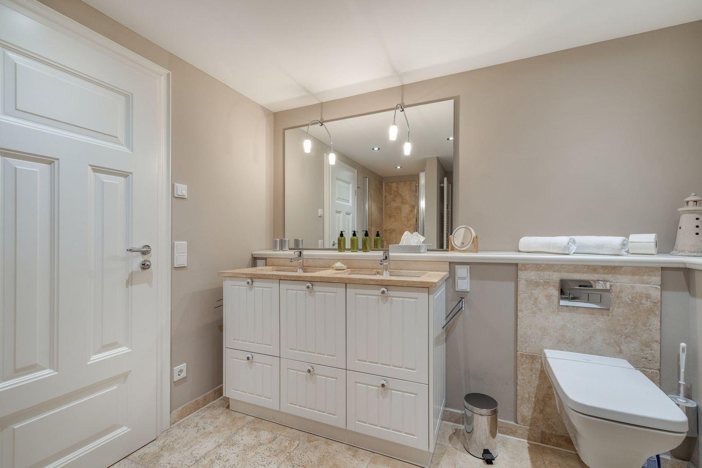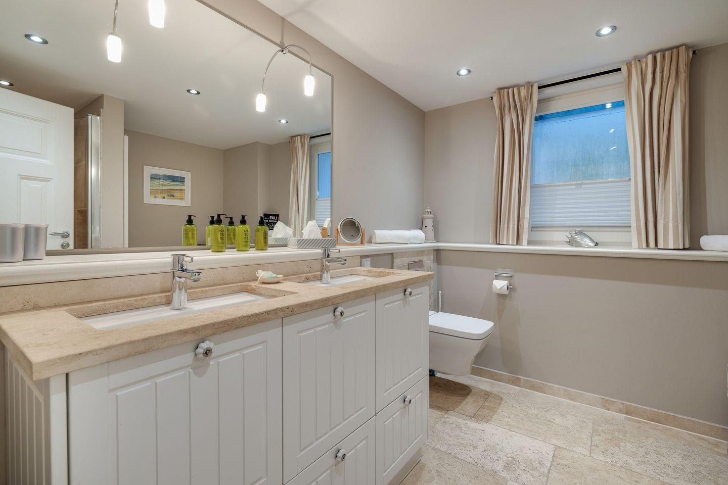 Der großzügige Bereich im Untergeschoss wird Ihnen sicherlich ein "Wow !" entlocken, finden Sie hier nochmals sehr viel Platz und eine sehr schöne Gestaltung vor. In zwei wertig dekorierten Räumen steht Ihnen je ein Doppelbett zur Verfügung (ca. 2x2m). Ihr Bad ist großzügig und wertig mit Naturstein verarbeitet. Neben einem Doppelwaschtisch finden Sie hier noch eine schöne Dusche vor.