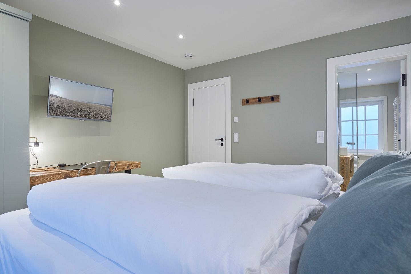 OG: Ein Schlafraum mit Doppelbett (180x210cm) + Flatscreen-TV, Dusche/WC, Badewanne/Dusche/WC