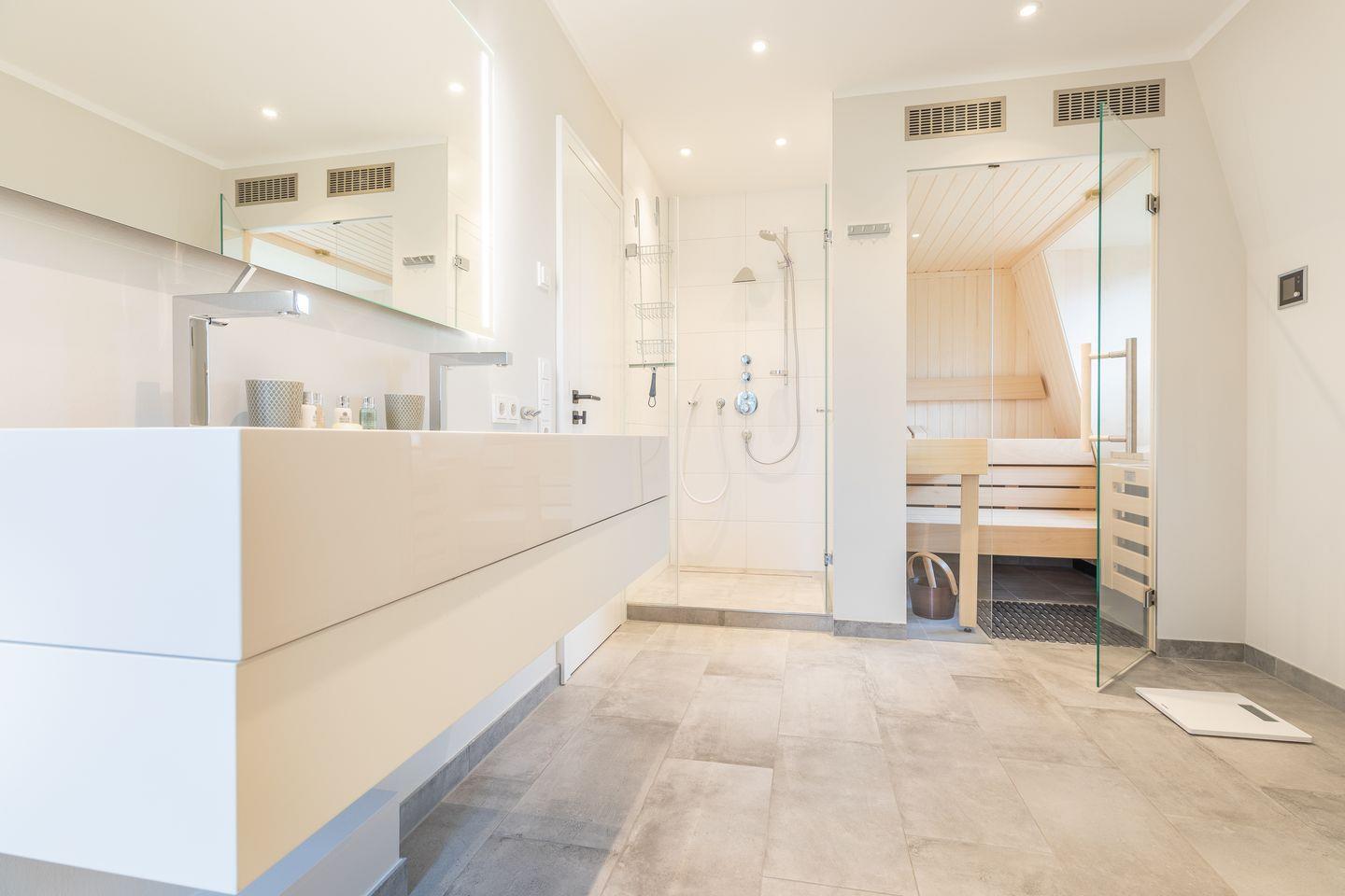 OG: 2 Schlafzimmer mit Boxspringbett (180x200cm [&] 160x200cm); Bad mit Badewanne, Dusche und Sauna