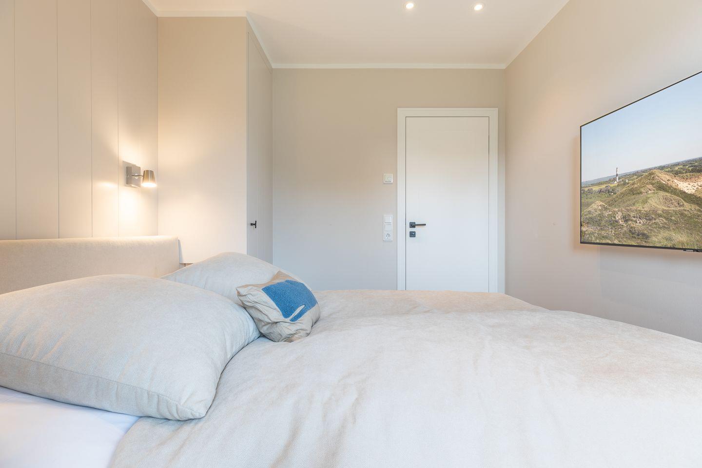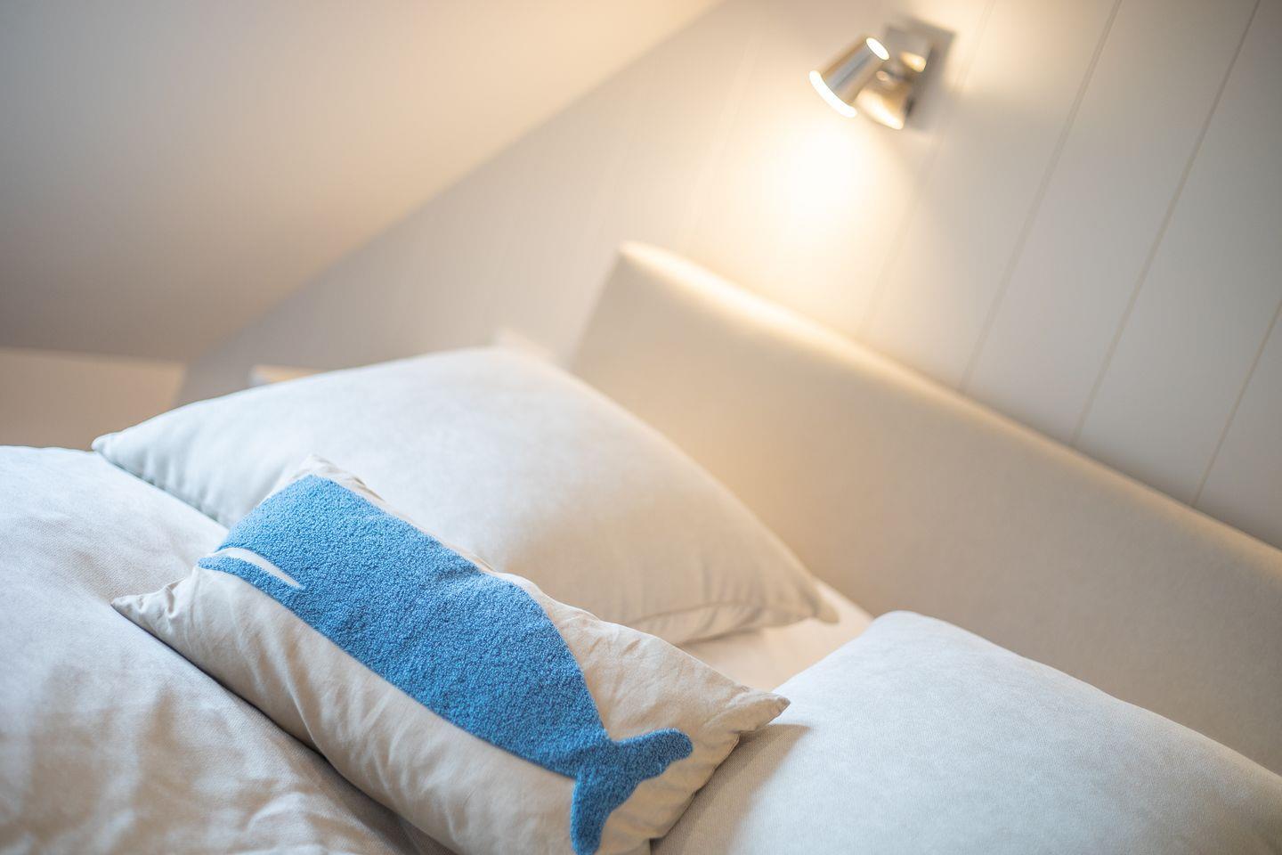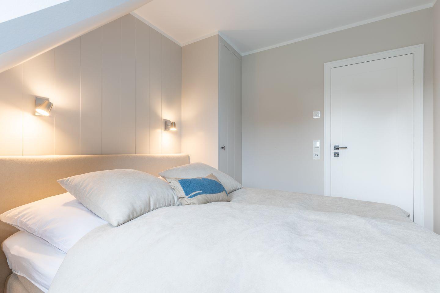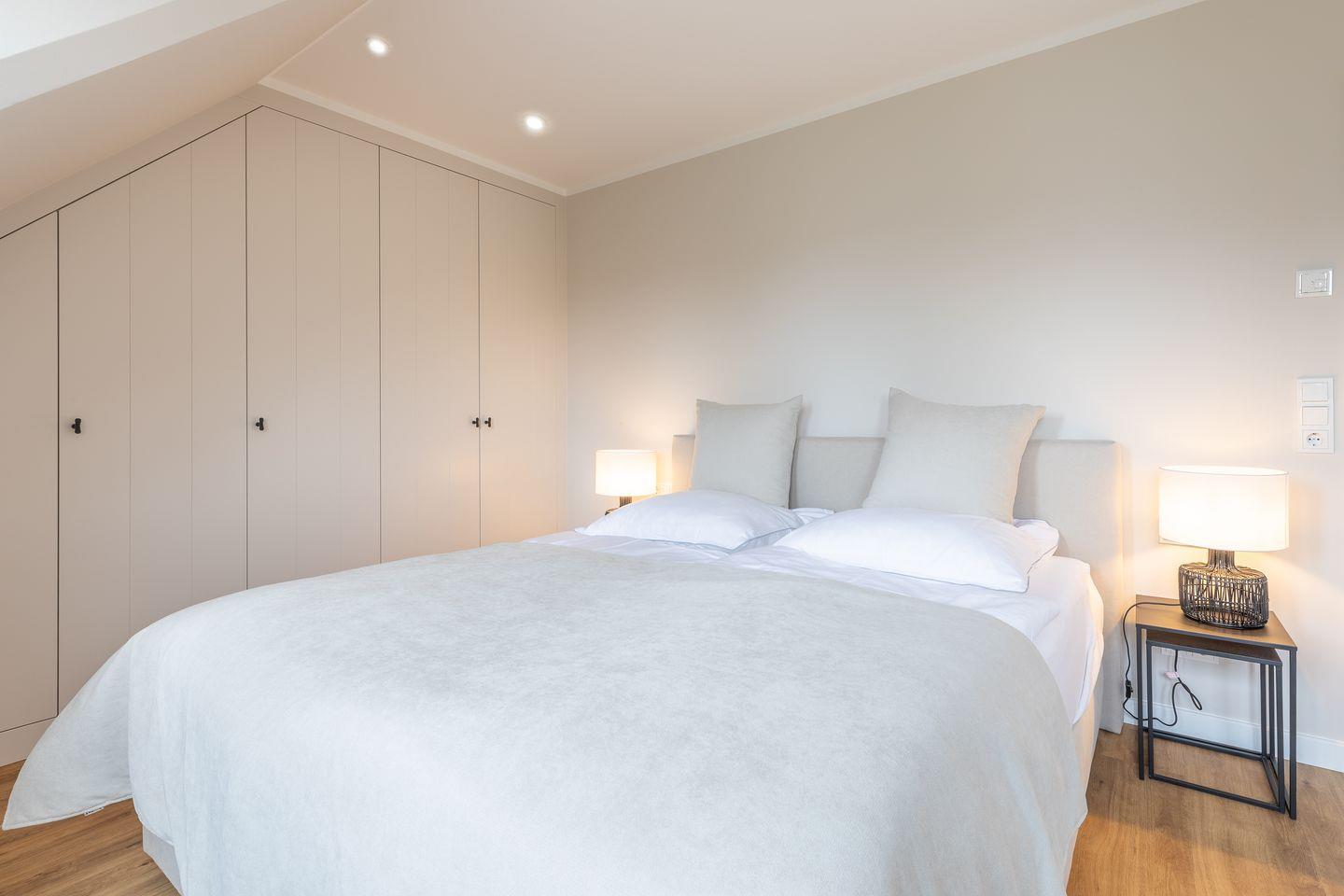 Im Obergeschoss laden zwei Schlafzimmer mit himmlisch gemütlichen Boxspringbetten und platzsparenden