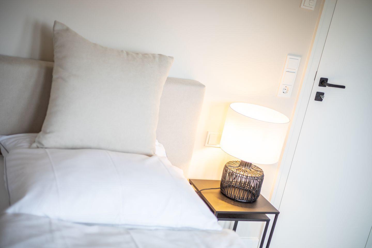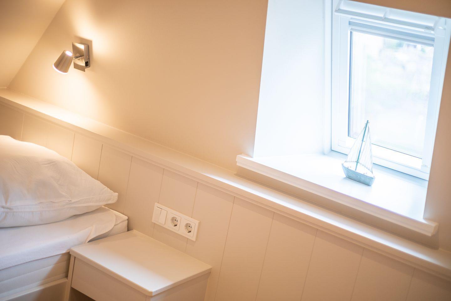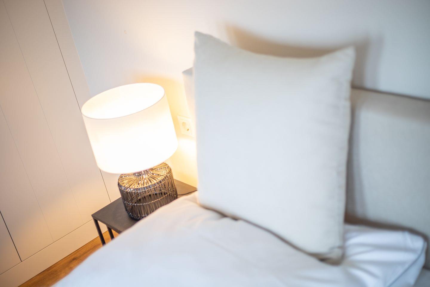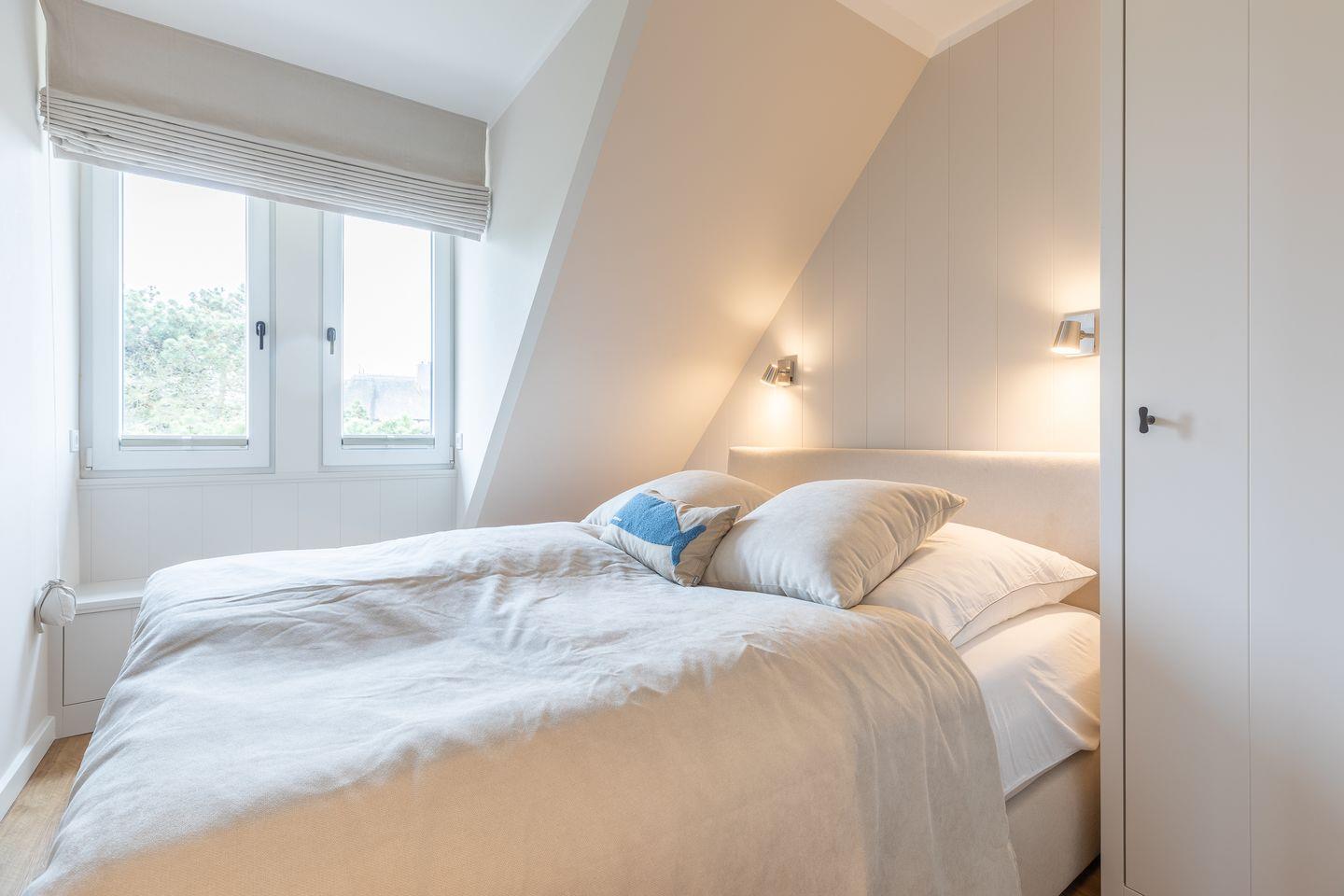 Im Obergeschoss laden zwei Schlafzimmer mit himmlisch gemütlichen Boxspringbetten und platzsparenden