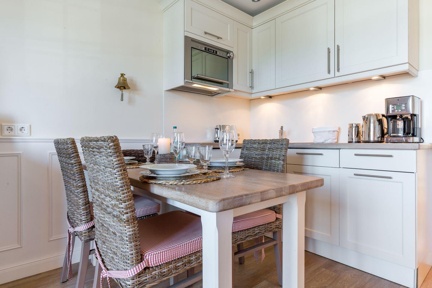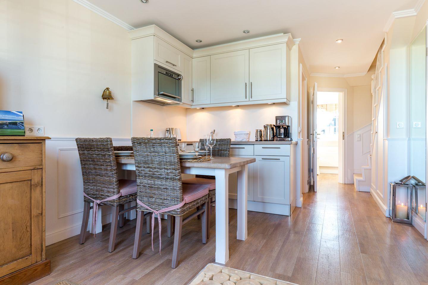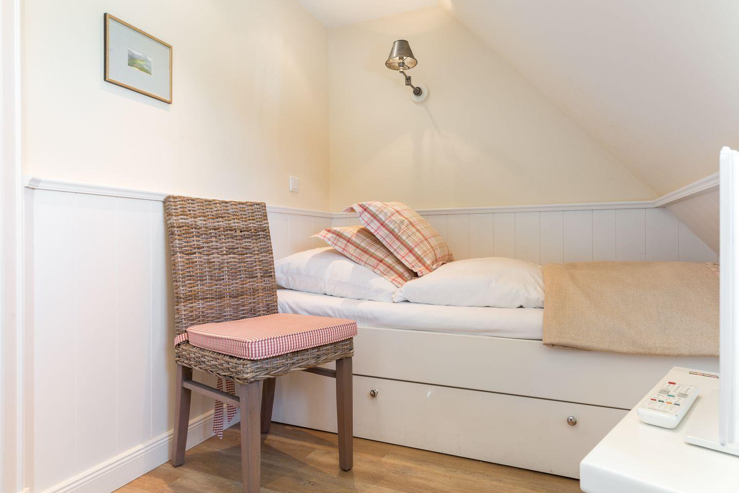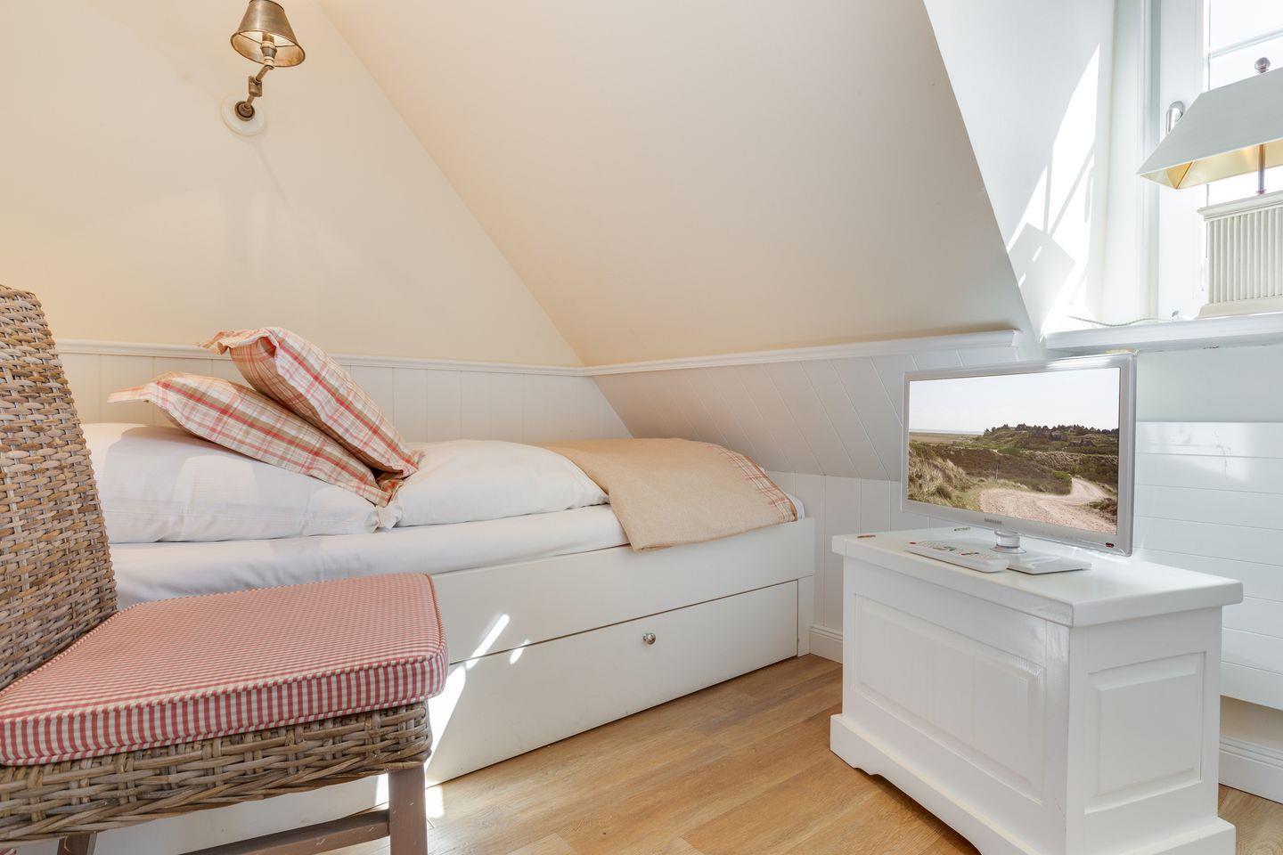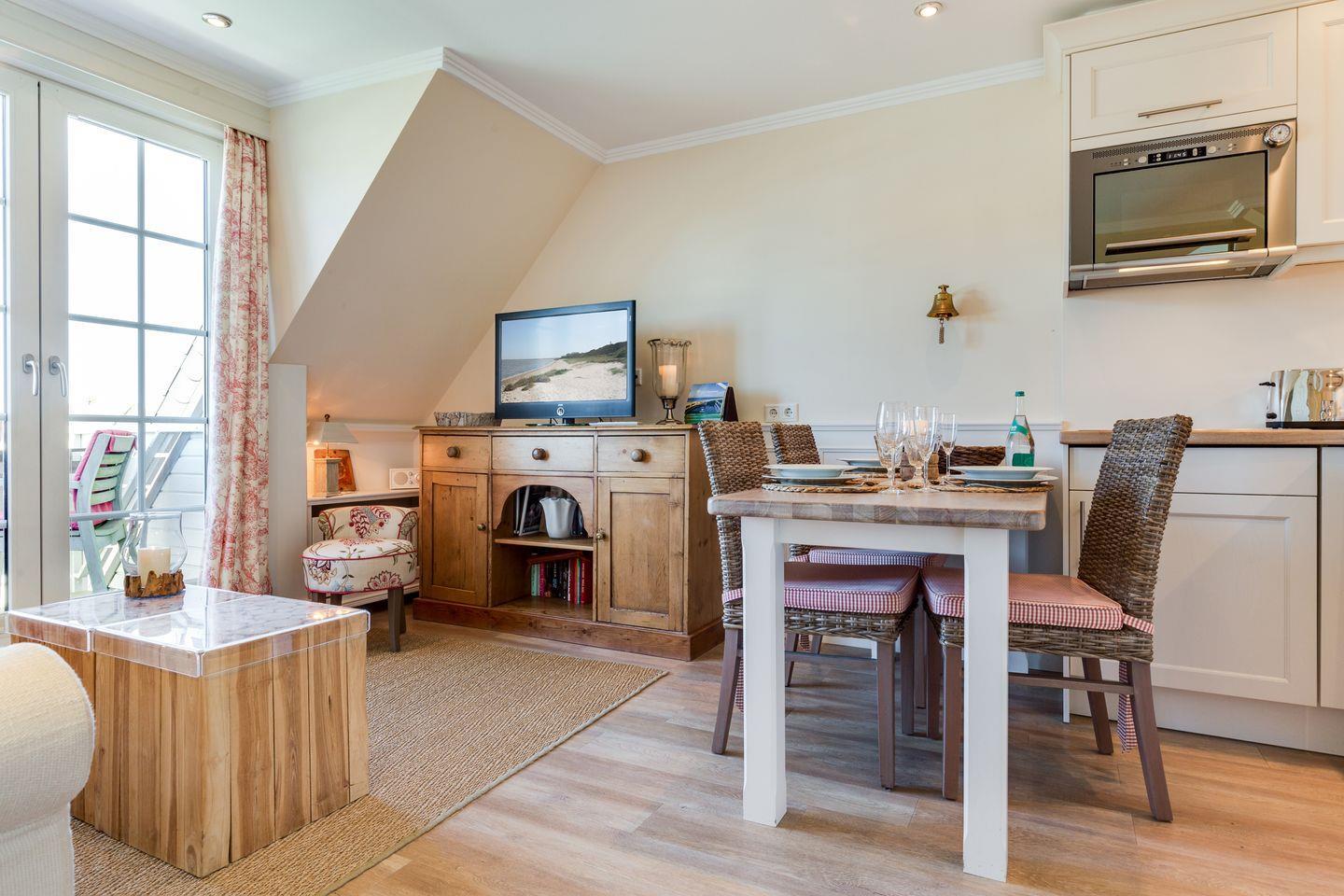 Die offene Küche ist modern eingerichtet und bietet Ihnen eine Mikrowelle, einen Geschirrspüler und einen Esstisch. Vom Wohnzimmer aus erreichen Sie den Balkon, auf dem Sie im Sommer die Sylter Abendsonne genießen können. Auf gleicher Ebene finden Sie das moderne Badezimmer mit Dusche und WC sowie ein Schlafzimmer mit einem Einzelbett und TV.