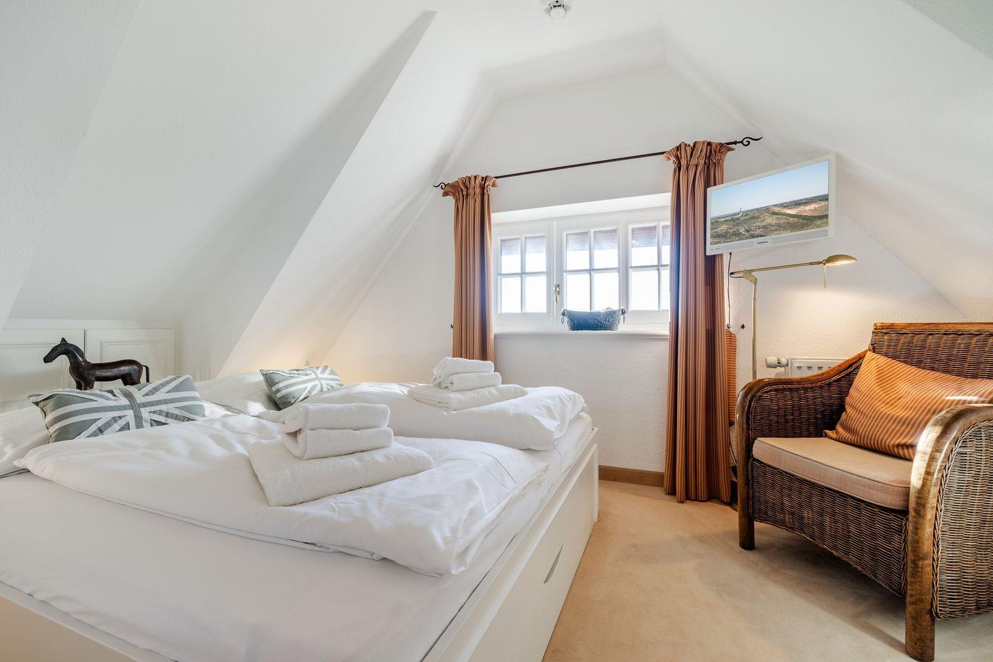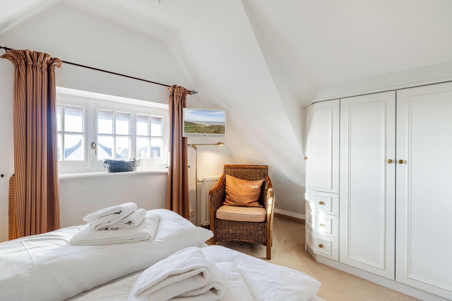 Obergeschoss: geschmackvoll und farblich gekonnt aufeinander abgestimmte Möblierungen, Farben und Stoffe. Kabel-TV, Hifi-Anlage. Luxuriöse integrierte Küche mit Geschirrspüler und einem Mikrowellen-Backofen-Kombigerät. 1 Schlafraum mit 2 getrennten Betten (90x200cm) und sehr schönen Einbauten. Wohlfühl-Bad mit Dusche und WC. Sonniger West-Balkon mit Teak-Gartenmöbeln und eigenem Strandkorb.