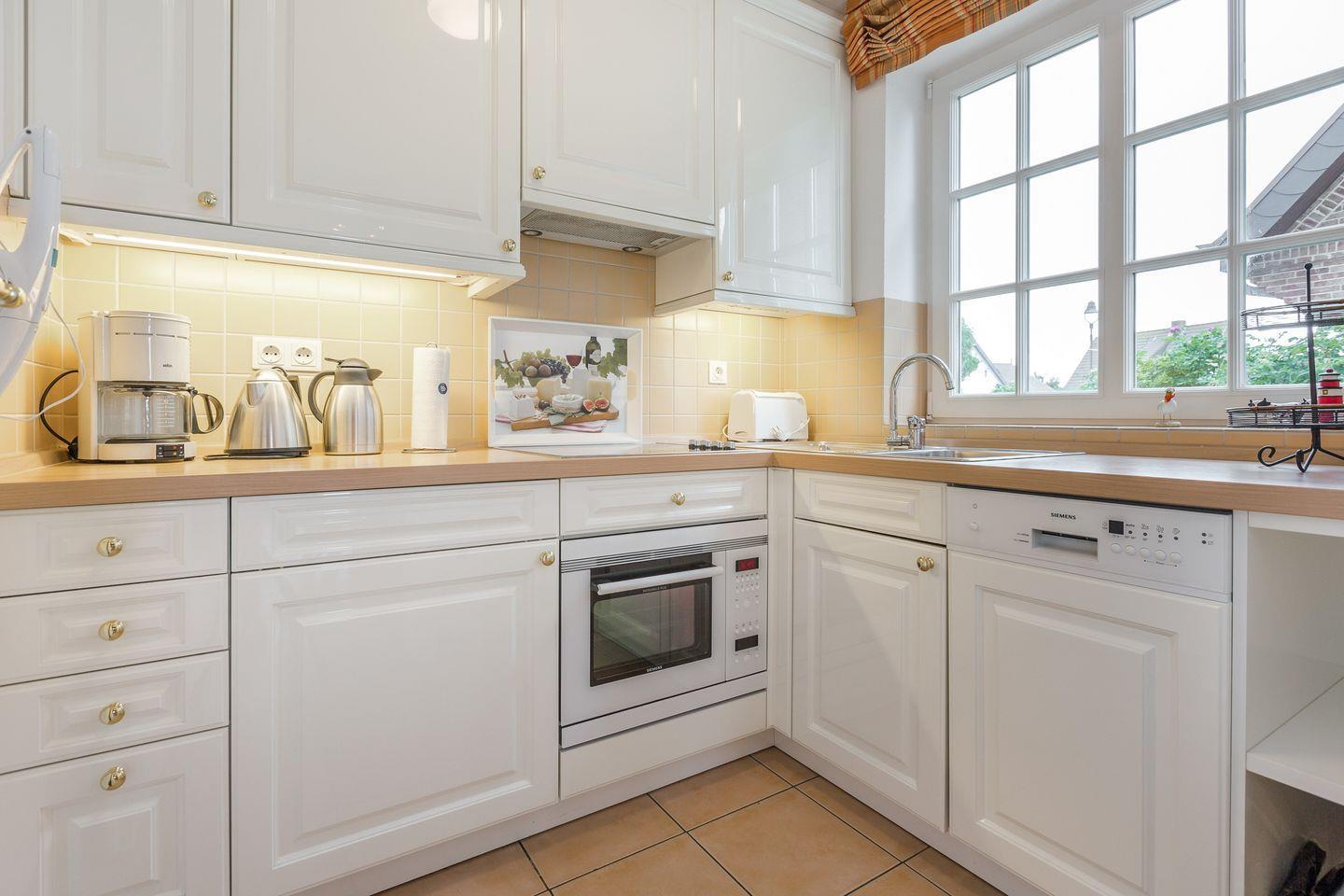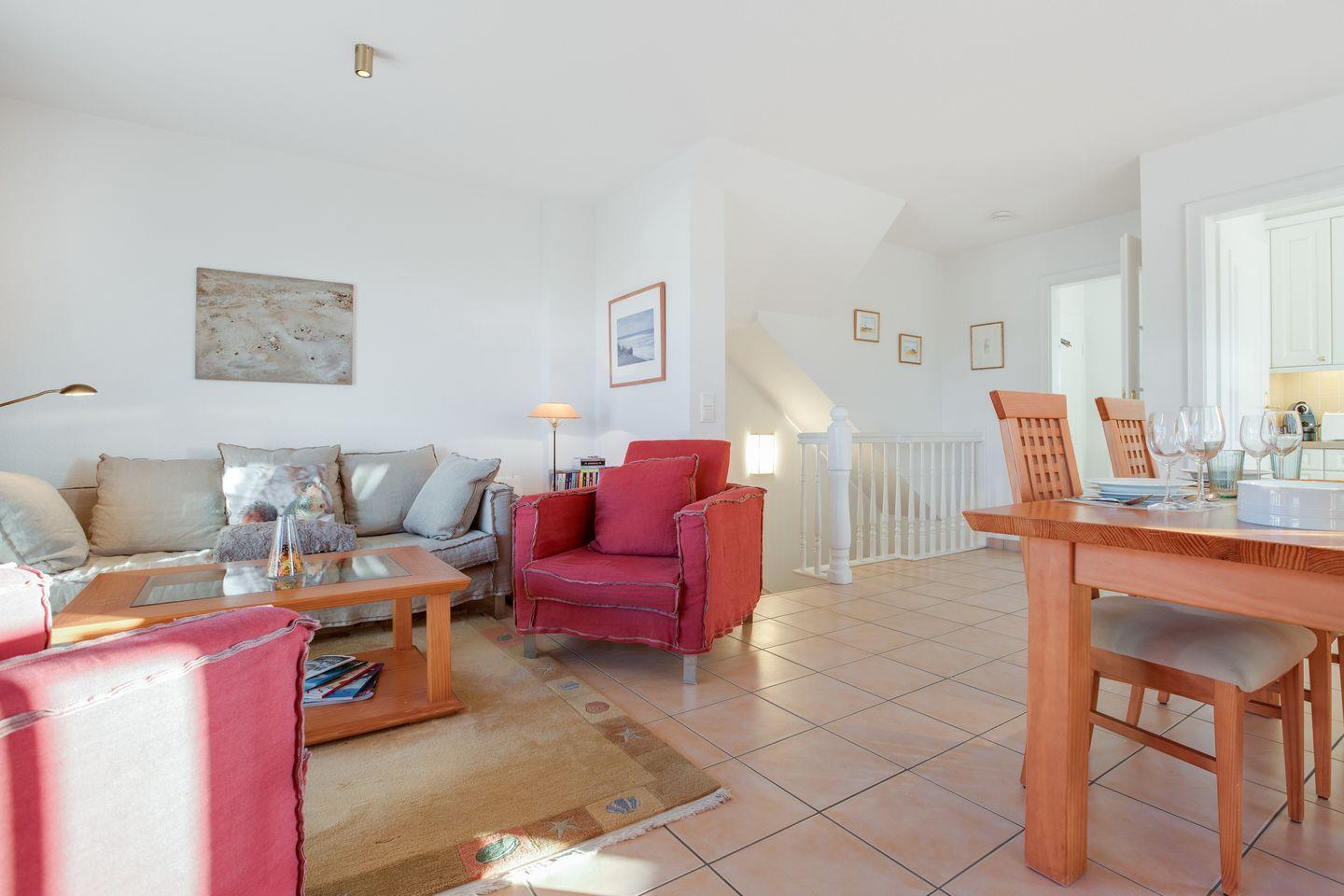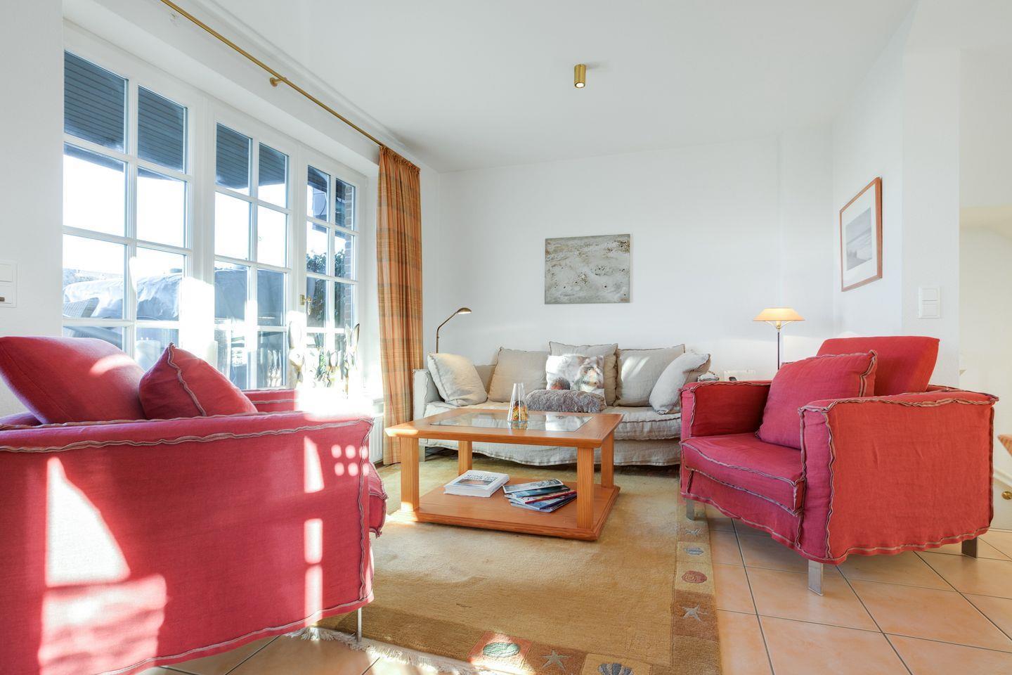 Erdgeschoss: Geschmackvoll und hochwertige möblierter Wohnraum mit Flatscreen-Kabel-TV, Hifi-Anlage und Telefon. Luxuriöse Küche mit Geschirrspüler, Mikrowellen-Backofen-Kombination. Gäste-WC. Sonnige West-Terrasse mit Gartenmöbeln und Strandkorb.