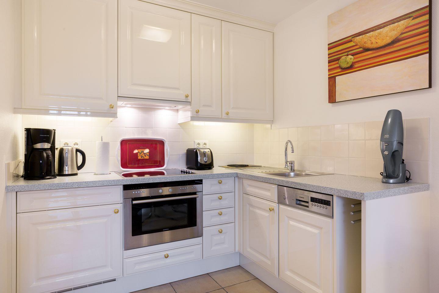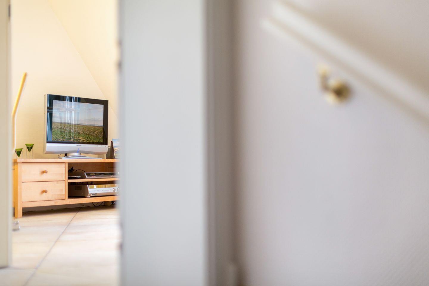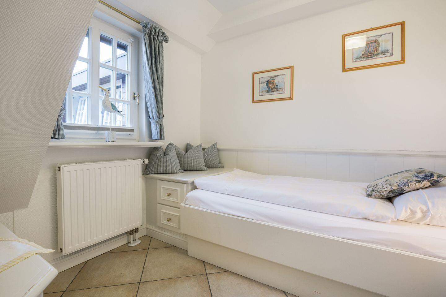 Obergeschoss: geschmackvoll möblierter Wohnraum mit fein selektierten Farben und Stoffen. Kabel-Flatscreen TV. Die integrierte Küche mit Geschirrspüler und einer Mikrowellen-/Backofenkombi. 1 Schlafraum mit einem Bett (90x200cm), das zusammen mit korrespondierenden Einbauschränken sehr schön in den Raum integriert ist. Bad mit großzügiger Dusche und WC. Sonniger West-Balkon.